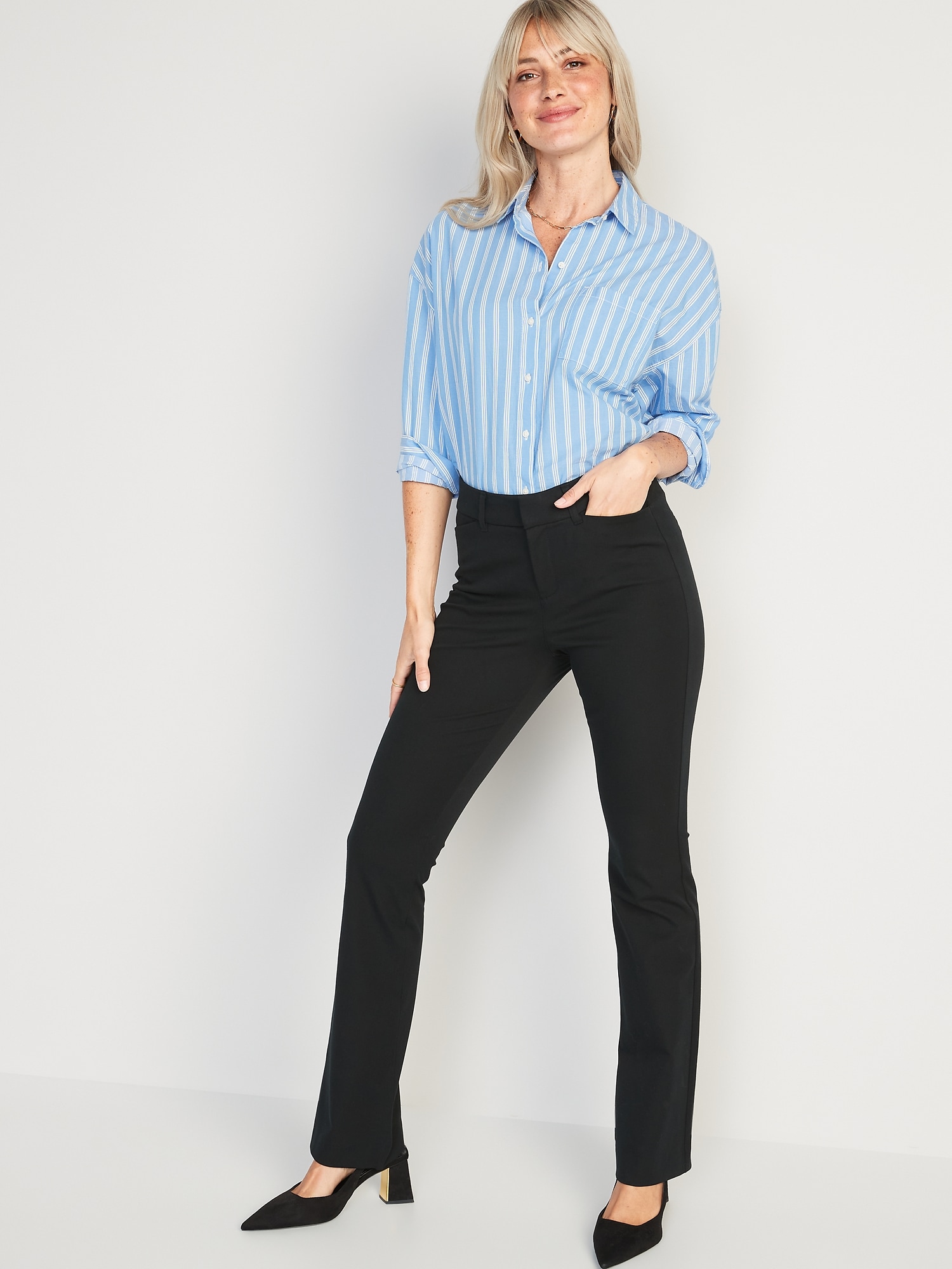 High-Waisted Pixie Flare Pants: The stretchy profesh pant you love, with just enough flare.belt loops, hook-and-bar closure, interior button, zip fly, front pockets, faux-welt back pockets, online exclusive, available in maternity sizes, #611133