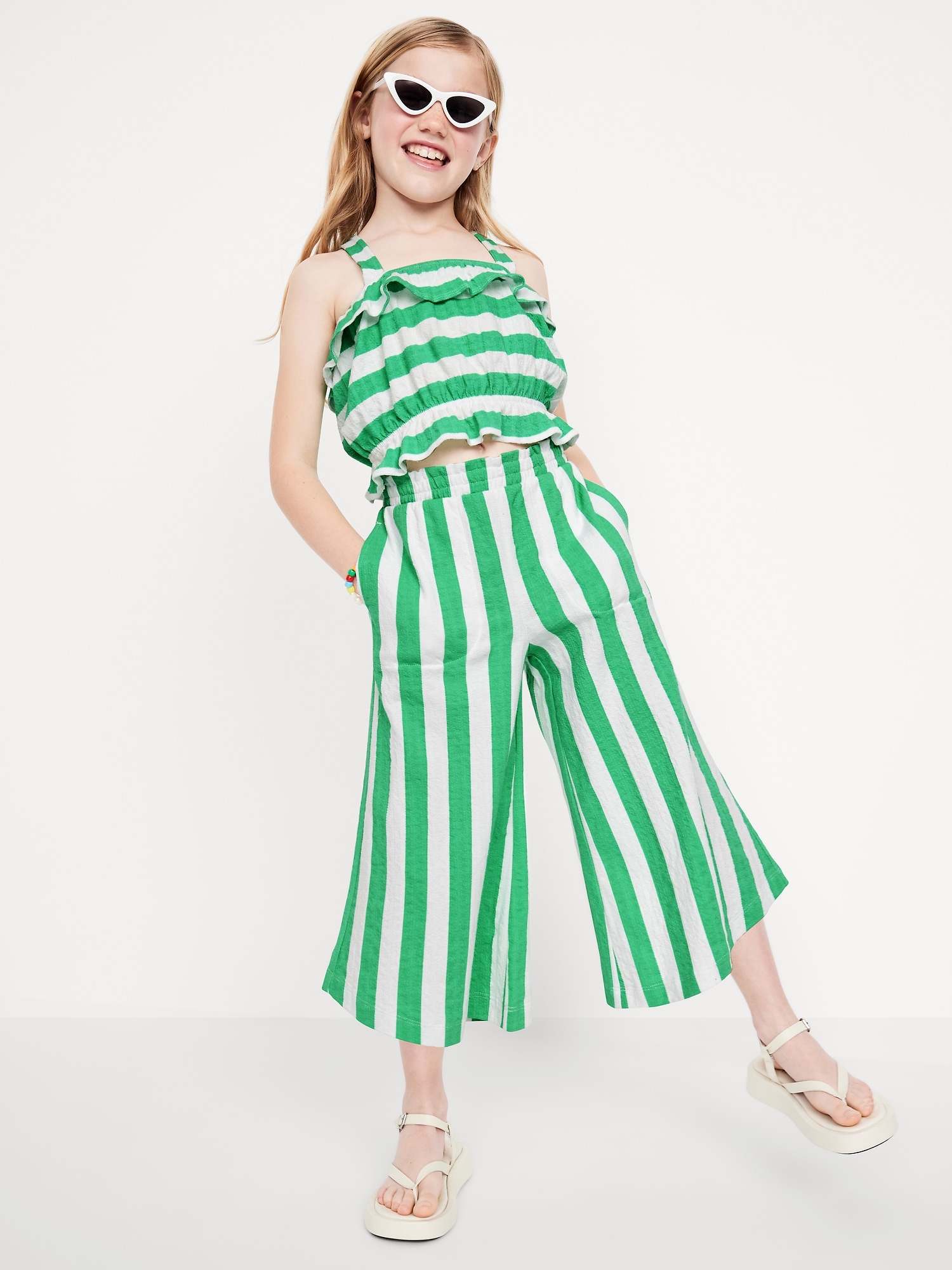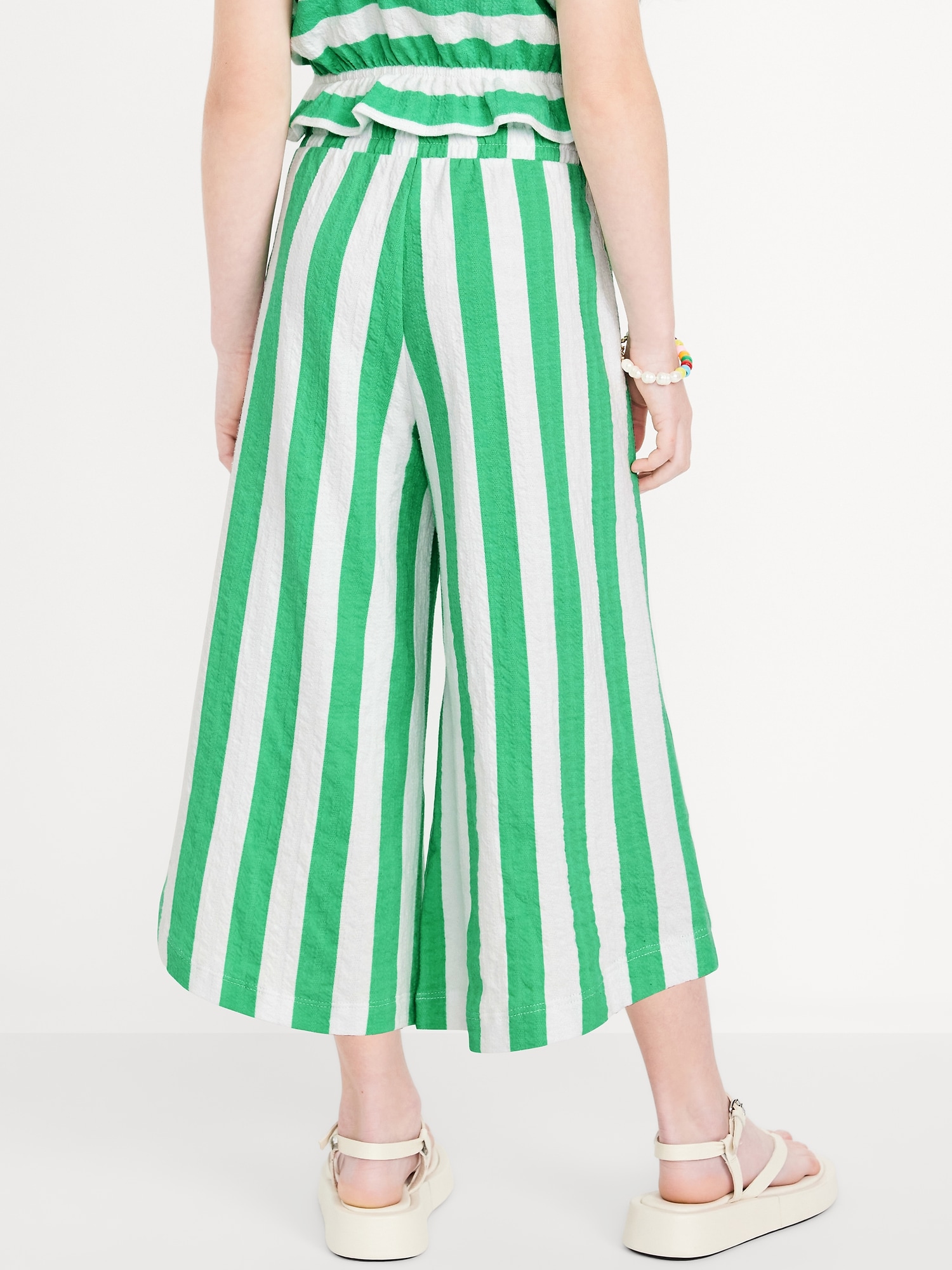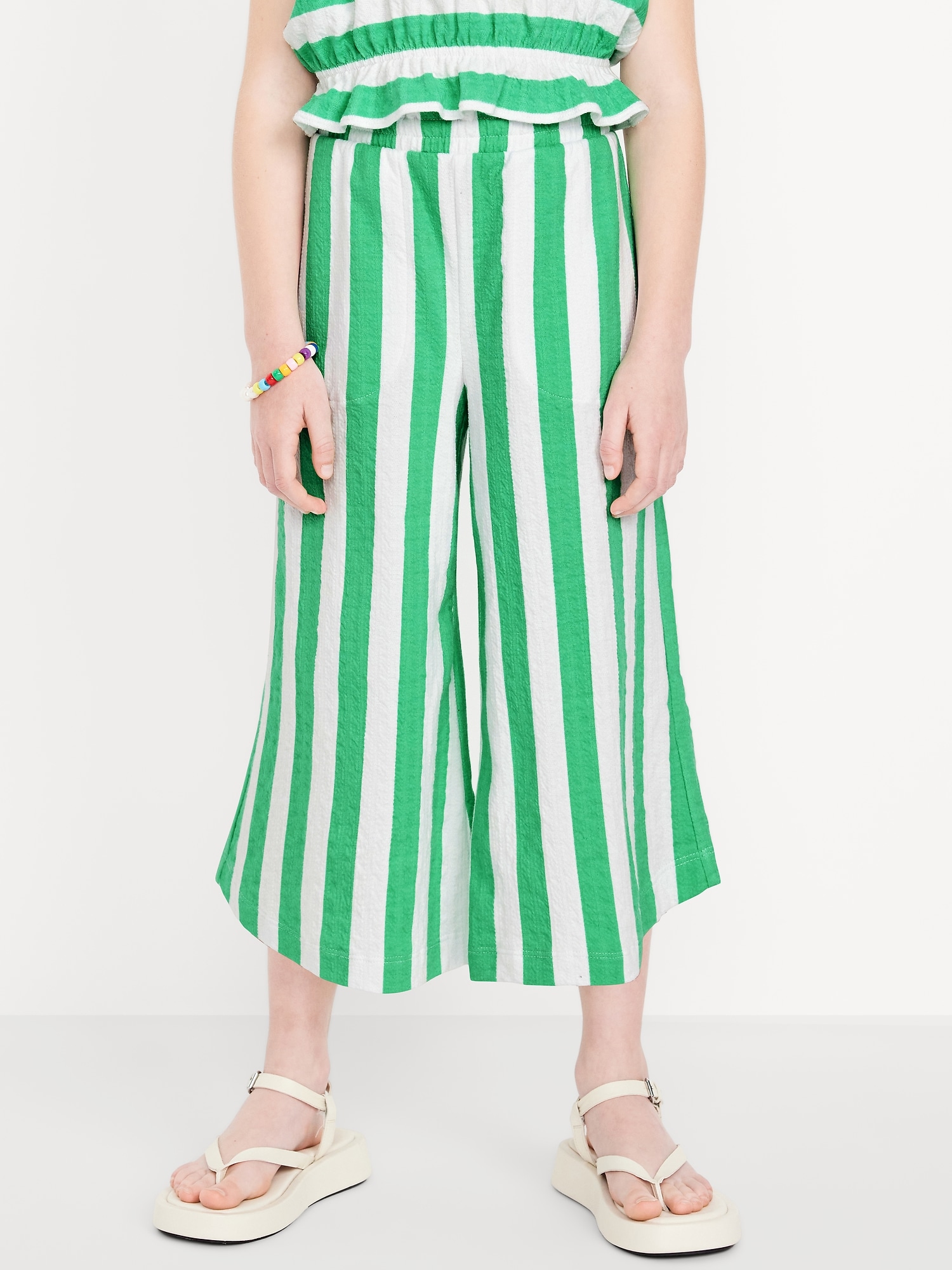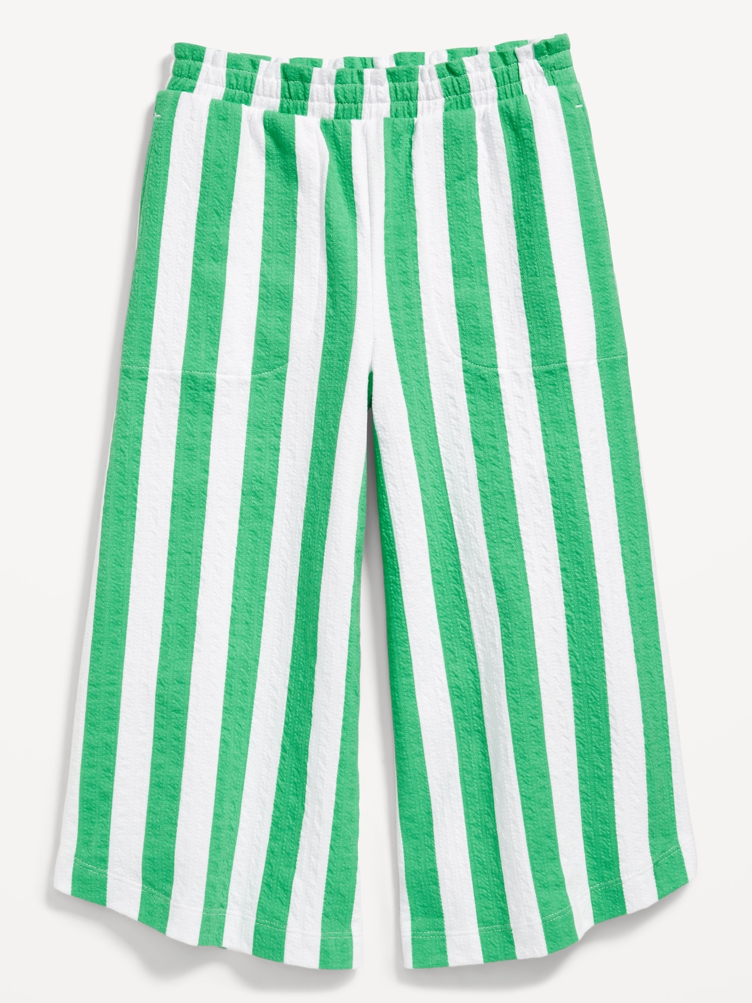High-Waisted Pucker Wide-Leg Pants for Girls: ruffle elastic waistband, on-seam pockets, curved leg, wide contrasting stripes, #767120