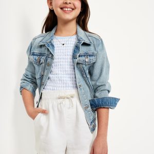 High-Waisted Pull-On Twill Shorts for Girls: high rise, elasticized waistband, functional drawstring, diagonal side pockets, all-over print, #767090