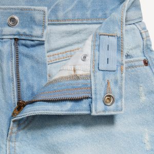 High-Waisted Ripped Frayed-Hem Jean Shorts for Girls: interior adjustable waistband, sizes 5-8 snap-button closure, sizes 10-20 regular button closure, zip fly, scoop pockets and coin pocket in front, patch pockets in back, rips/tears at front for a lived-in look, frayed hem, #855327
