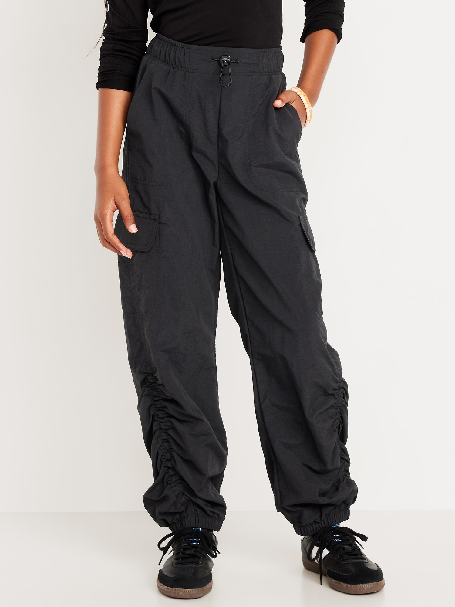 High-Waisted Side Ruched Cargo Parachute Joggers for Girls: elasticized waistband, functional drawcord, diagonal on-seam pockets, flap cargo pockets at each leg, ruching along each leg, cinched leg cuffs, #804775