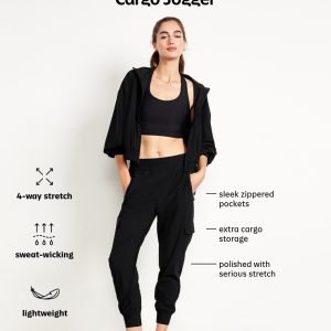 High-Waisted SleekTech Cargo Joggers: Featuring SleekTech. Polished and lightweight, with serious stretch.elastic waist, zippered hip pockets, flap-cargo pockets at thigh, go-dry wicks moisture, breathable, pull-on style, #569700
