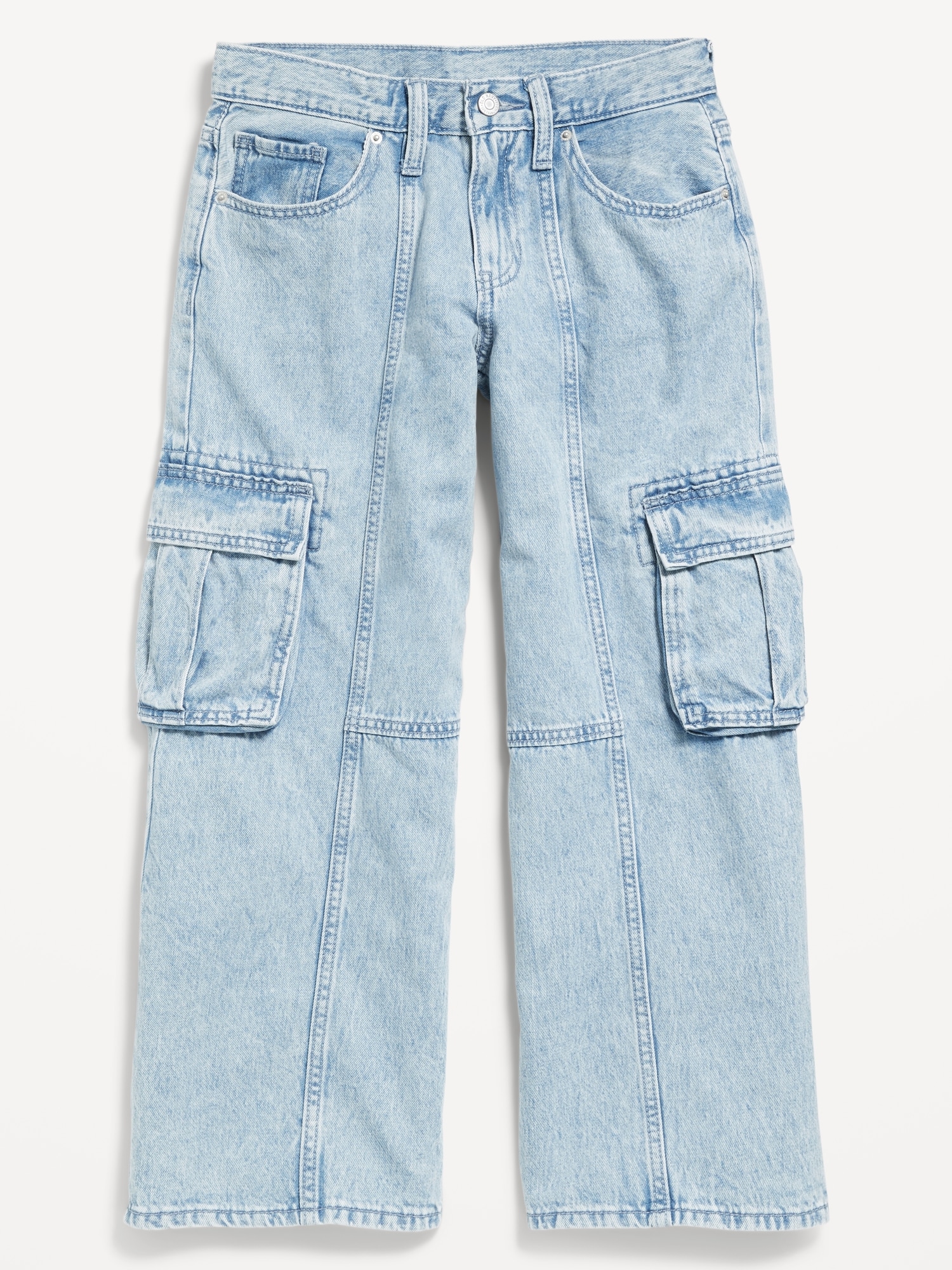 High-Waisted Super Baggy Wide-Leg Cargo Jeans for Girls: interior adjustable waistband, snap button closure (sizes 5-8), regular button closure (sizes 10-20), zip fly, scoop pockets and coin pocket, patch pockets at back, flap-cargo pockets, super wide leg opening, #583291