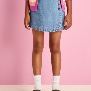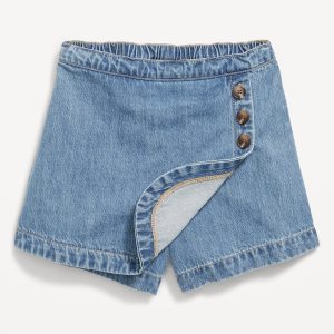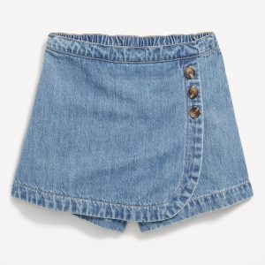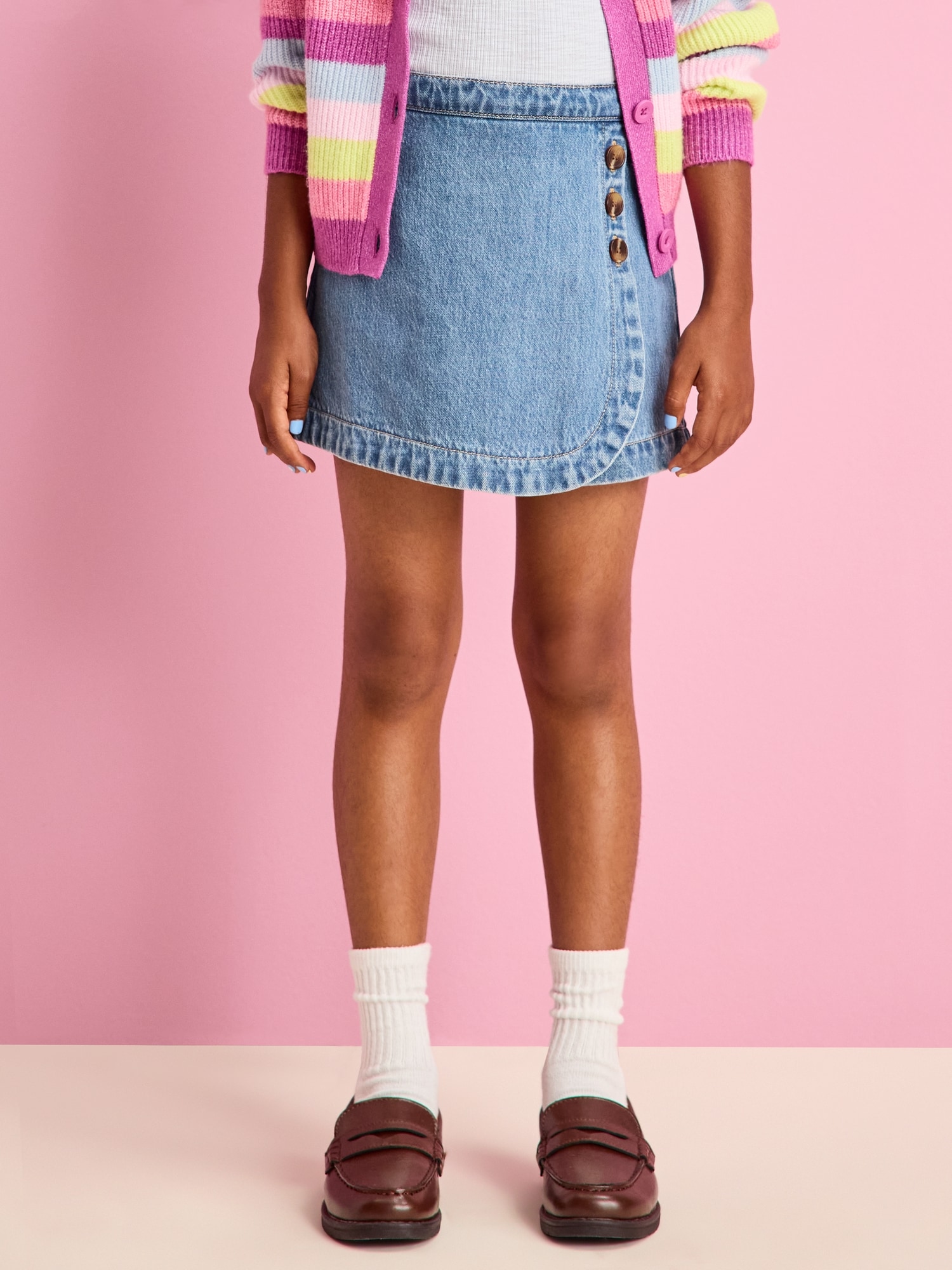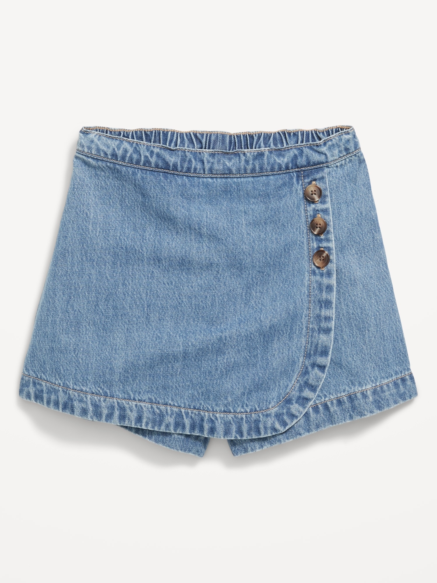 High-Waisted Wrap-Front Jean Skort for Girls: built-in shorts, elasticized back waist, decorative three-button front, easy pull-on style, #766700