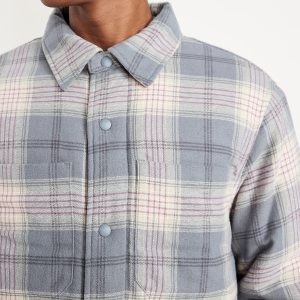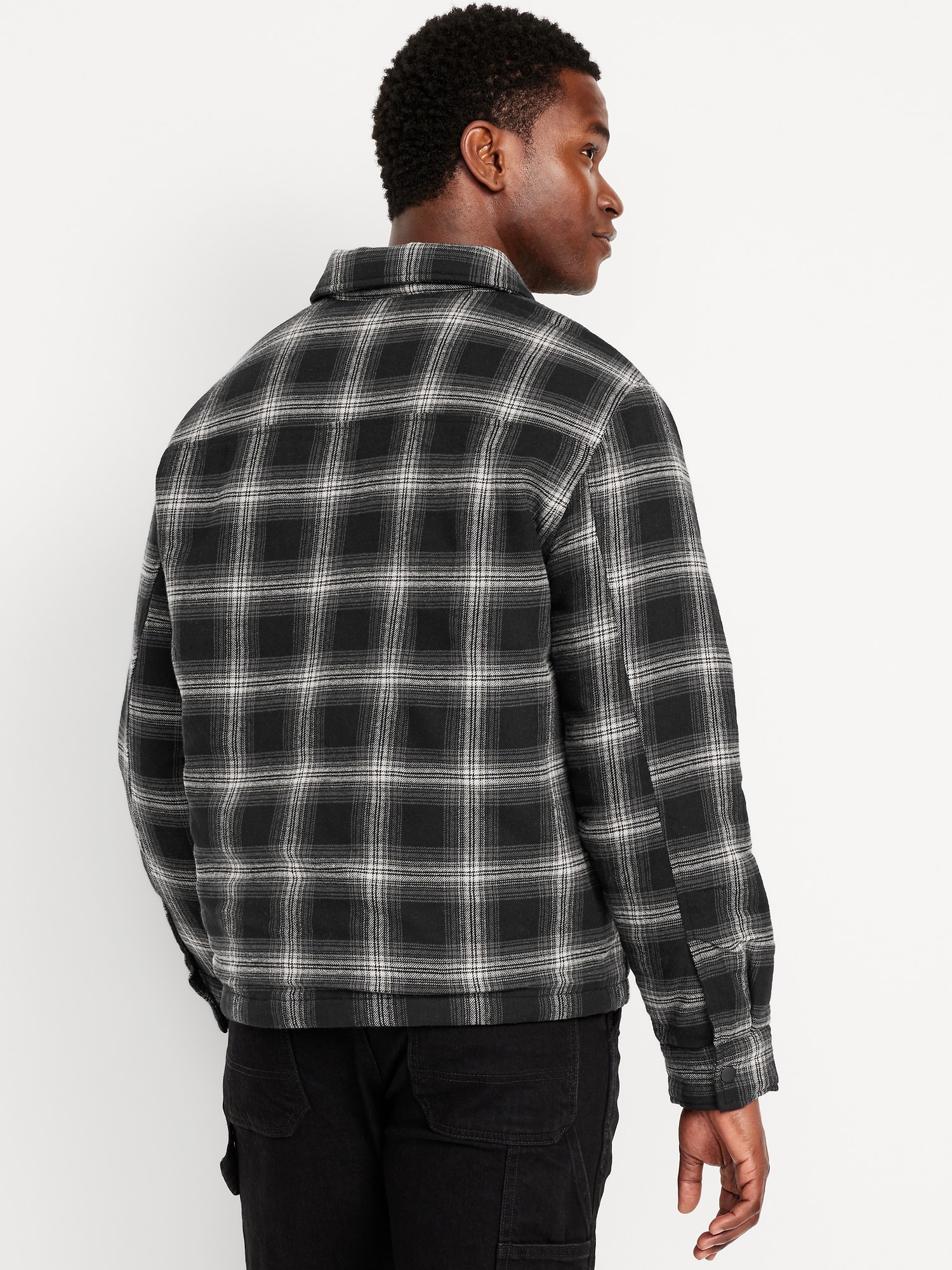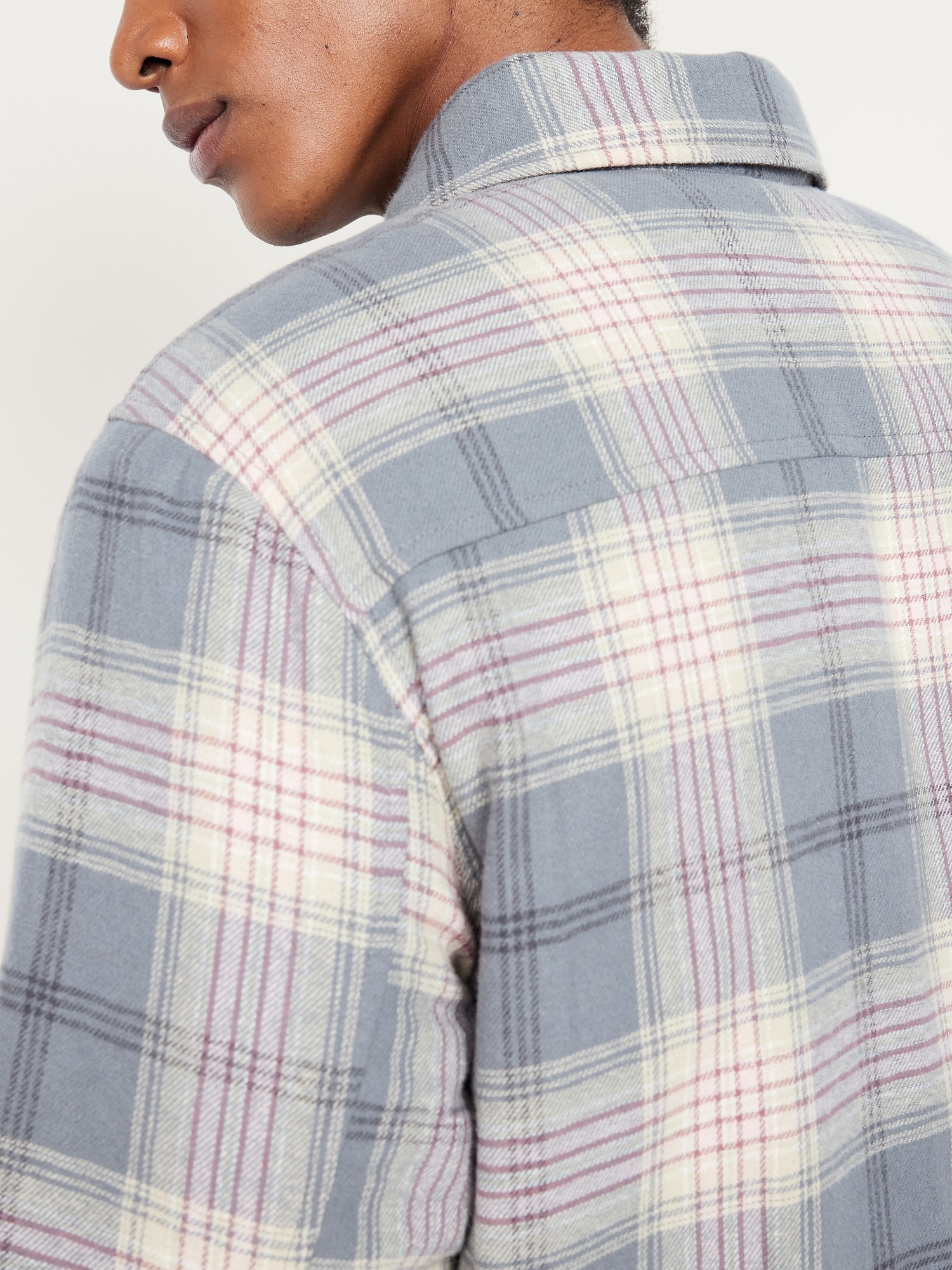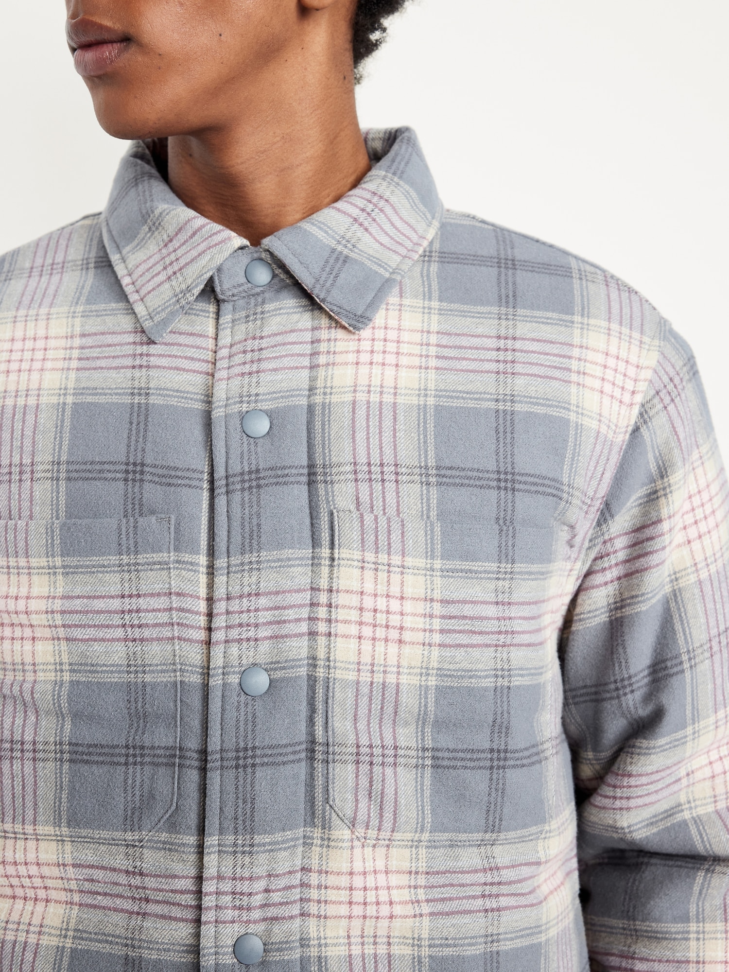 Insulated Cropped Flannel Shacket: spread collar, long sleeves with snap cuffs, full-snap front, patch chest pockets, plaid print, #800296
