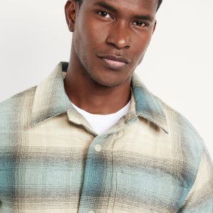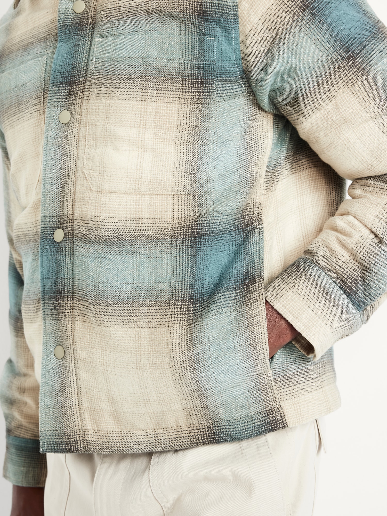Insulated Cropped Flannel Shacket: spread collar, long sleeves with snap cuffs, full-snap front, patch chest pockets, plaid print, #800296