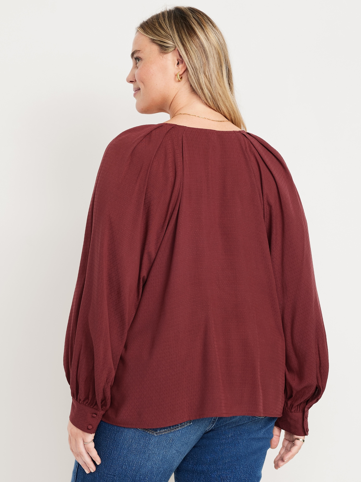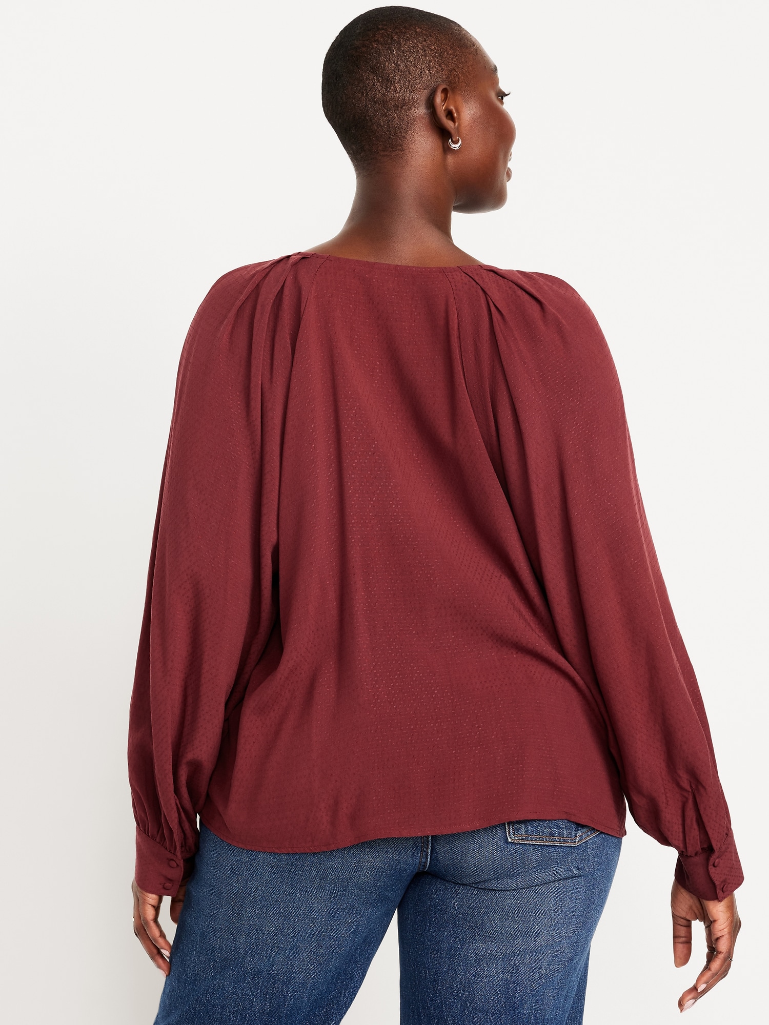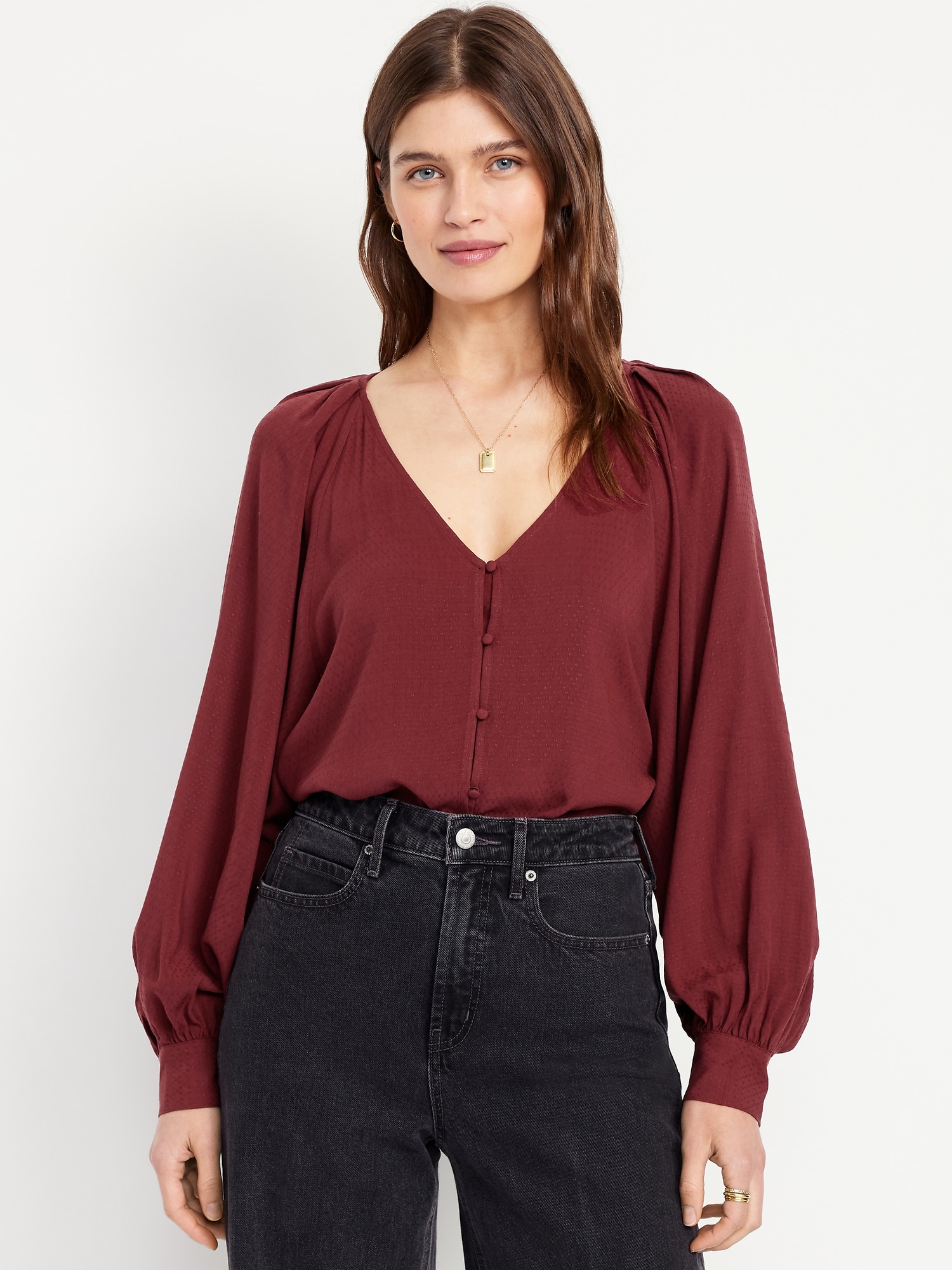 Jacquard Button-Down Top: v-neck, raglan sleeves with buttoned cuffs, full-button front, prints vary, #805742