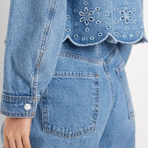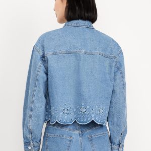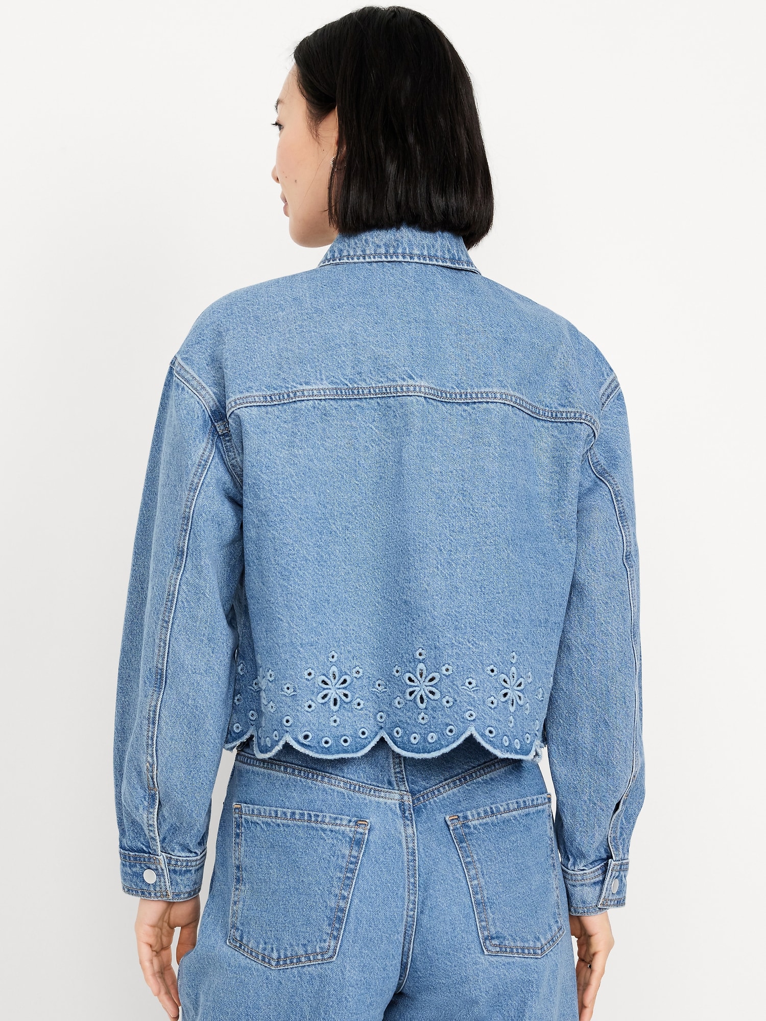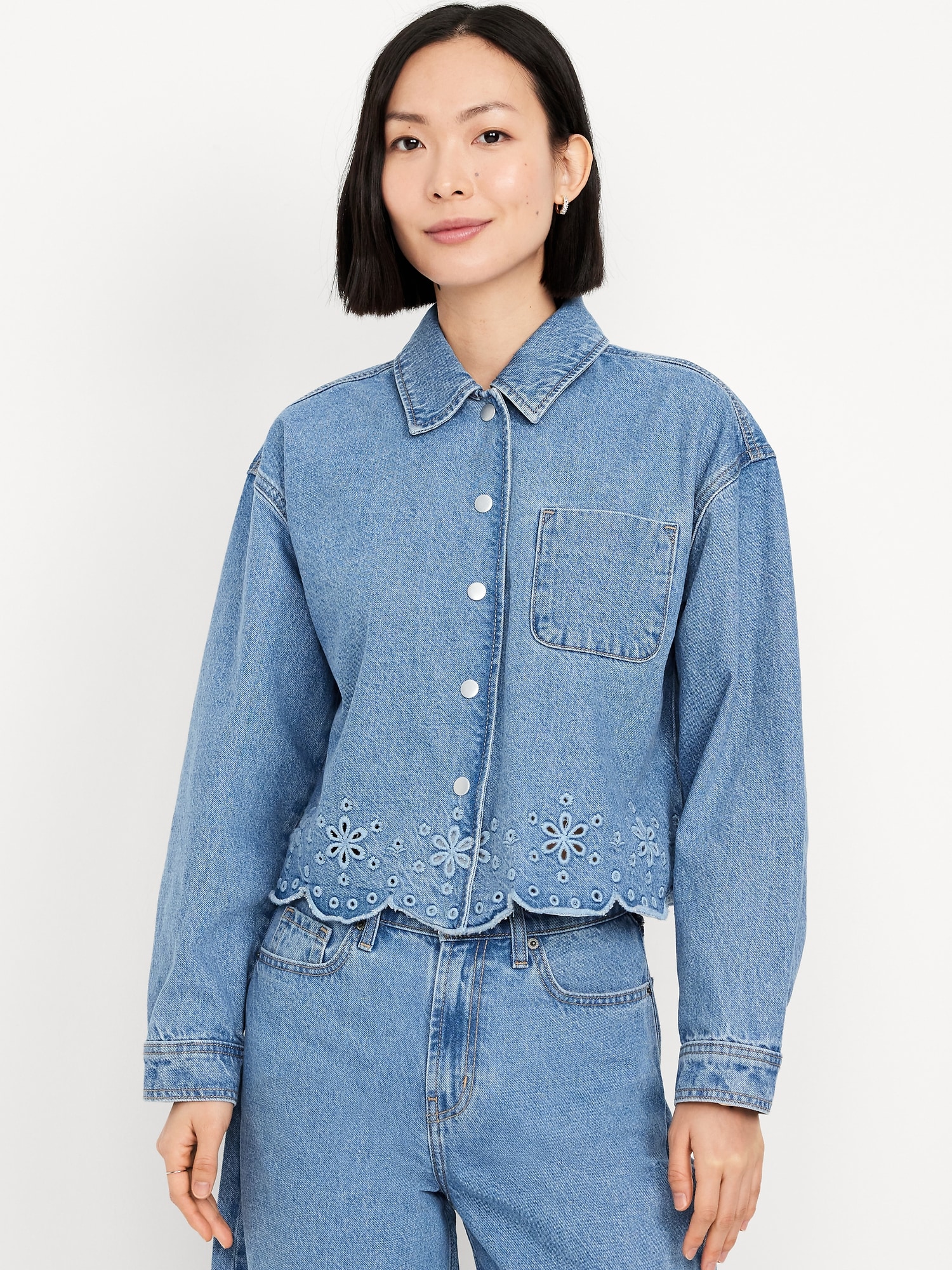 Jean Eyelet Jacket: spread collar, long sleeves with snap cuffs, full-snap front, patch chest pocket, embroidered eyelet trim, scalloped hem, #693759