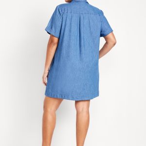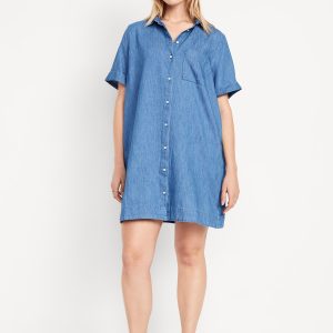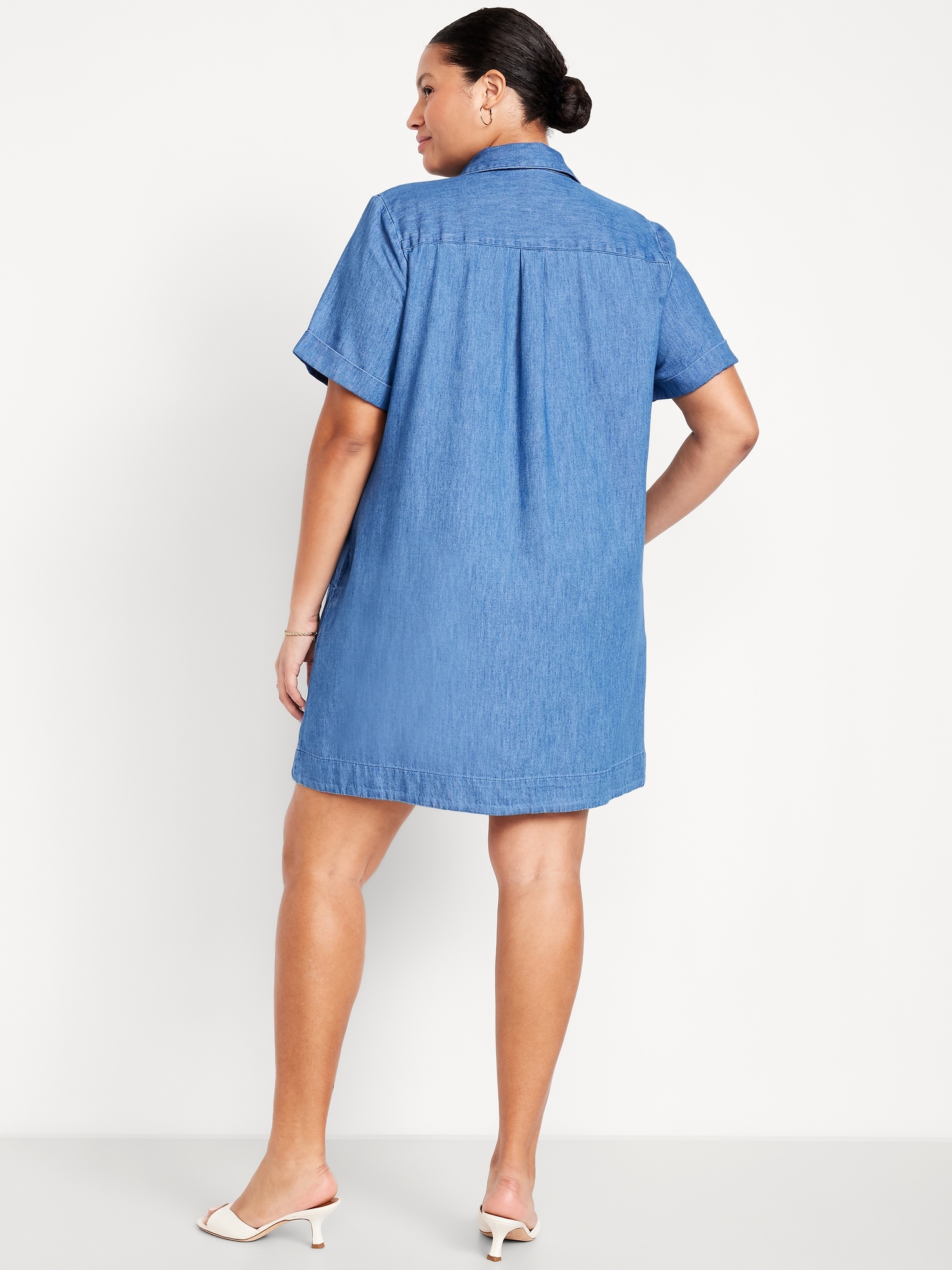 Jean Shirt Dress: spread collar, short sleeves, side-seam pockets, patch chest pocket, full-button front, #705355