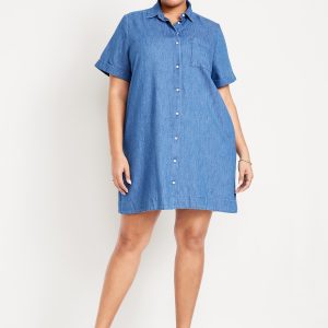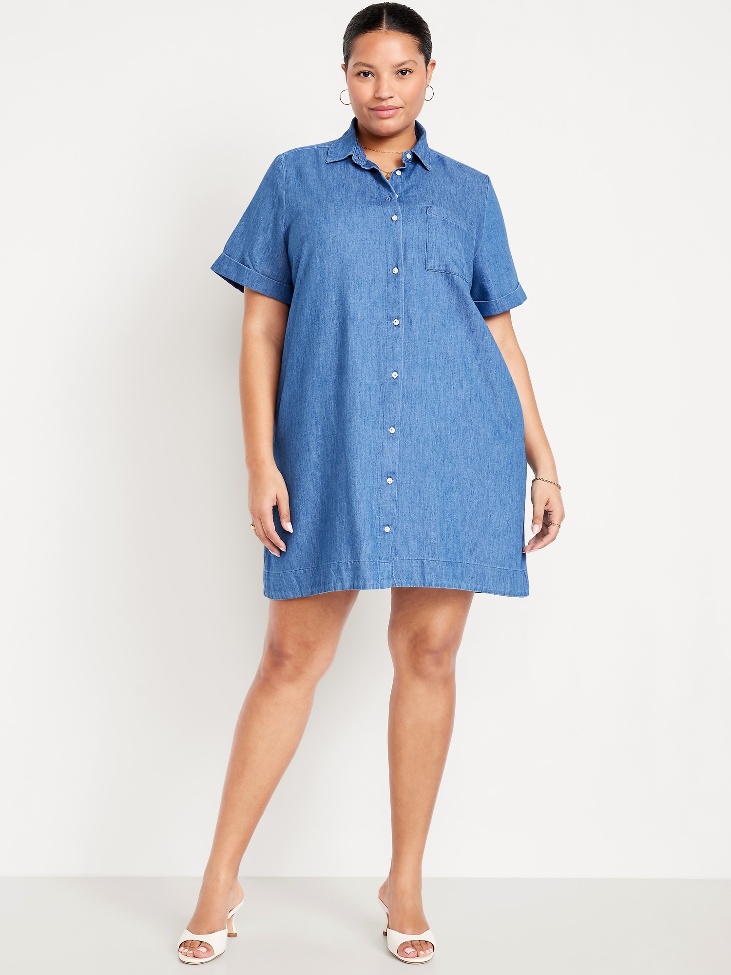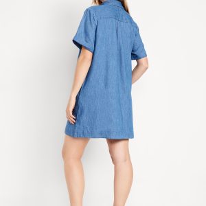 Jean Shirt Dress: spread collar, short sleeves, side-seam pockets, patch chest pocket, full-button front, #705355
