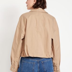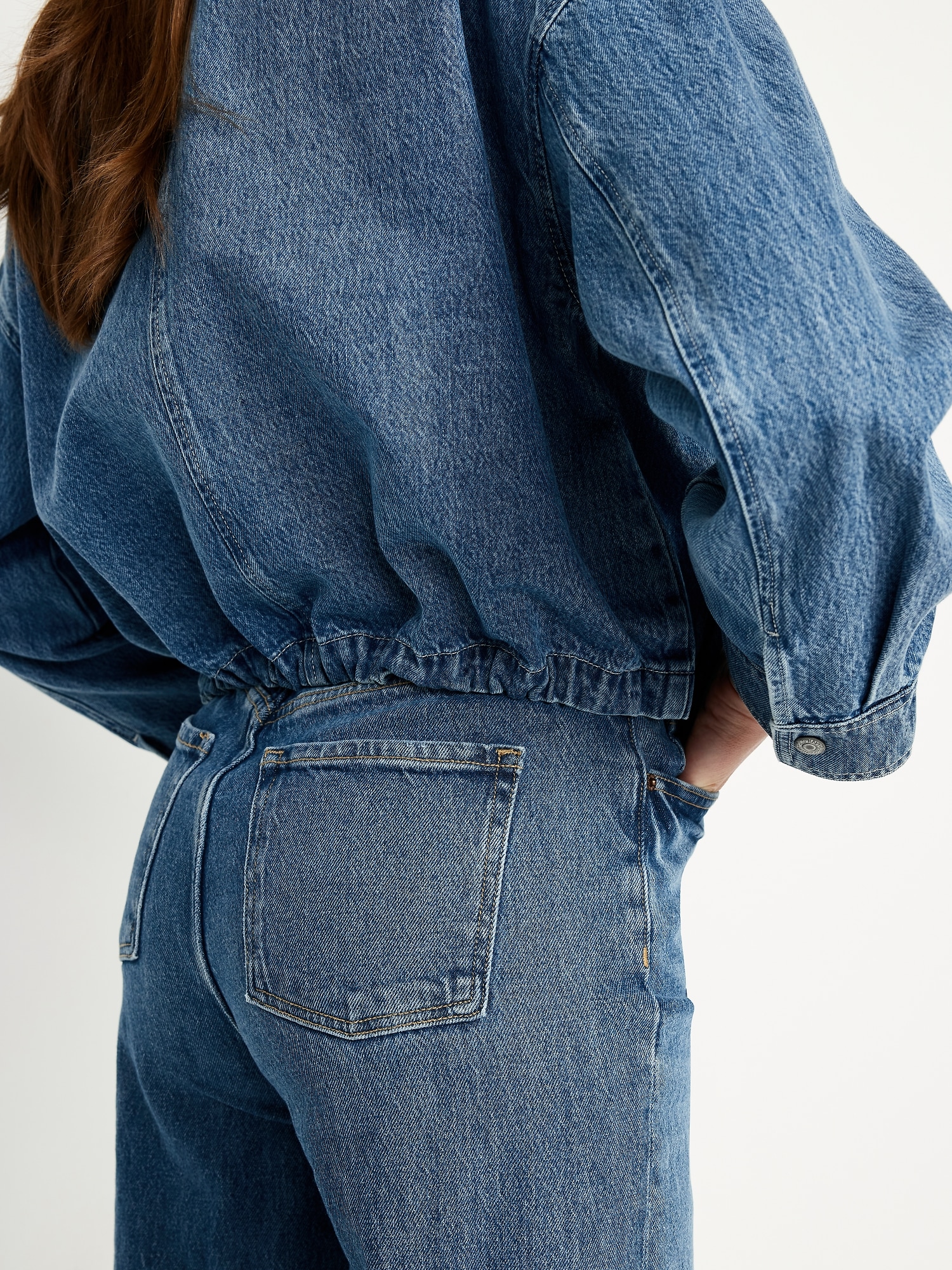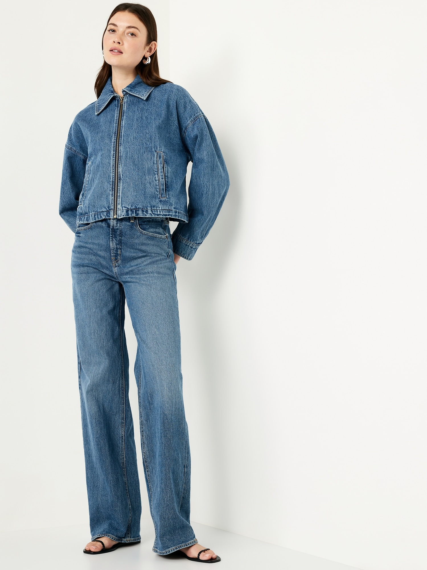 Jean Zip Jacket: spread collar, drop-shoulder sleeves with snap cuffs, full-zip front, welt pockets, cinched hem, #790492