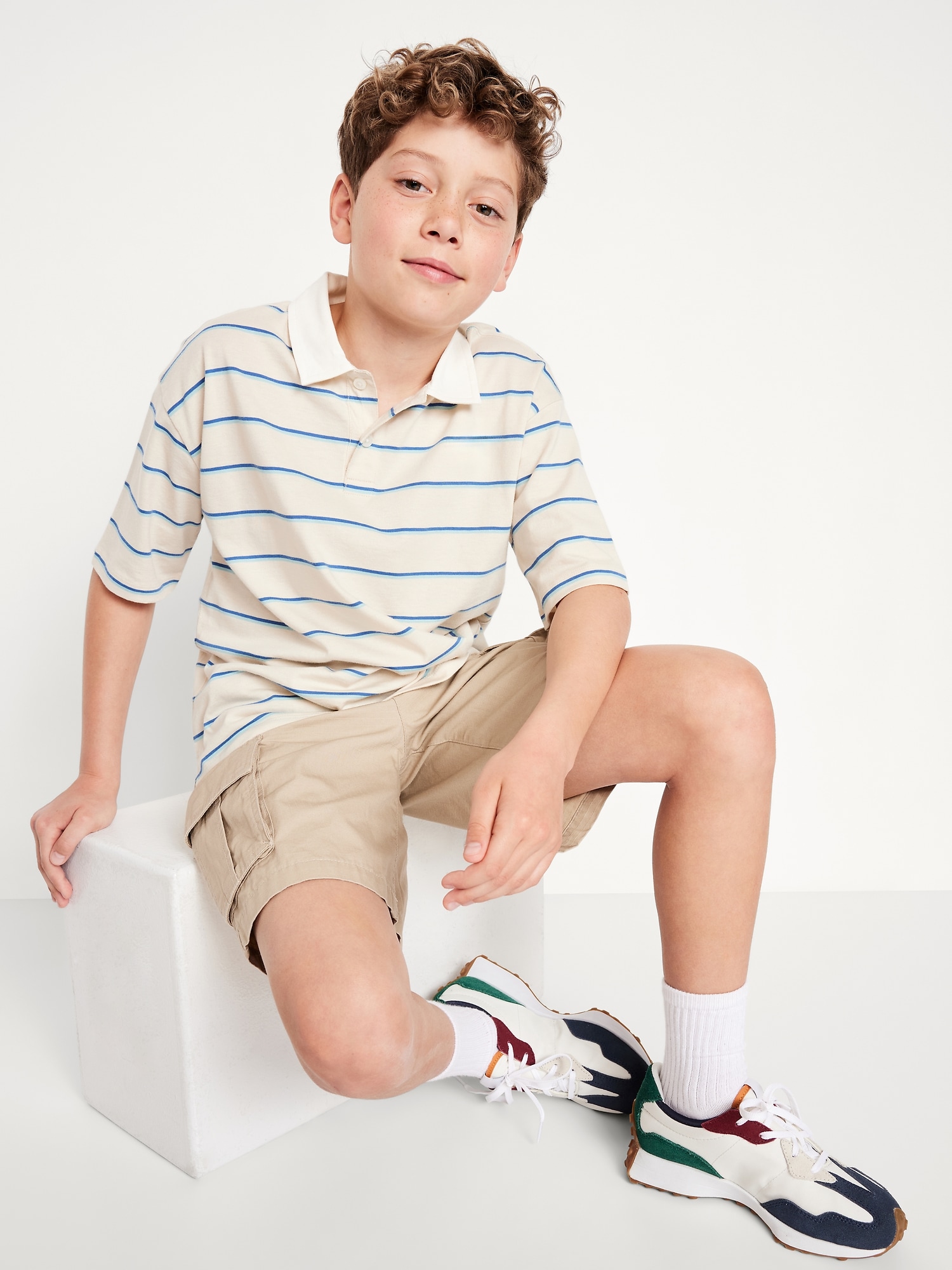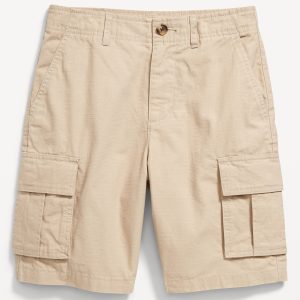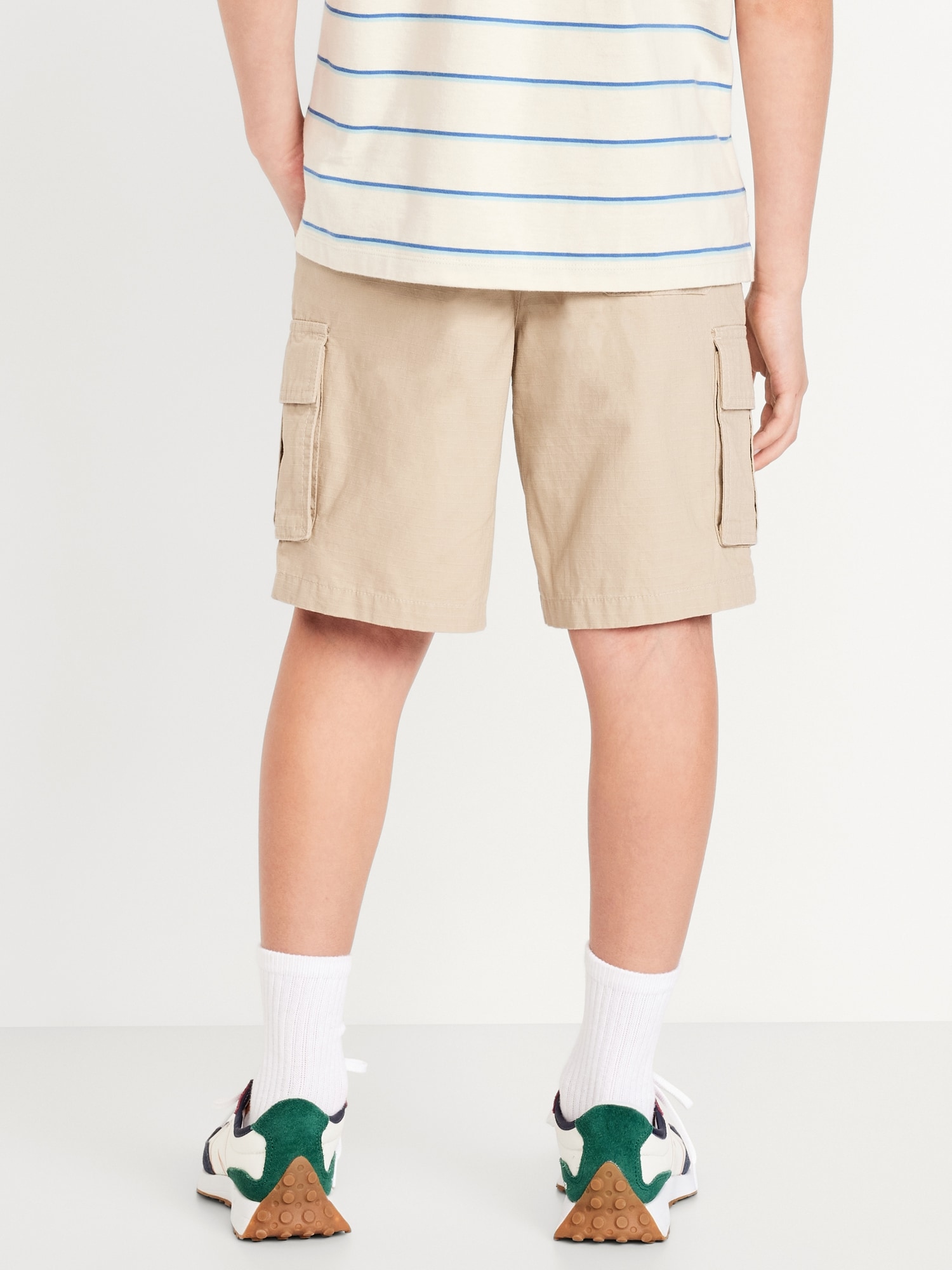 Knee Length Cargo Ripstop Shorts for Boys: interior adjustable waistband, button closure, zip fly, diagonal on-seam pockets, snap-button cargo pockets at each leg, single patch pocket at back, all-over print or solid color, #681416