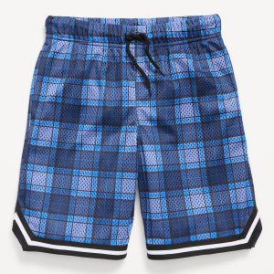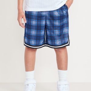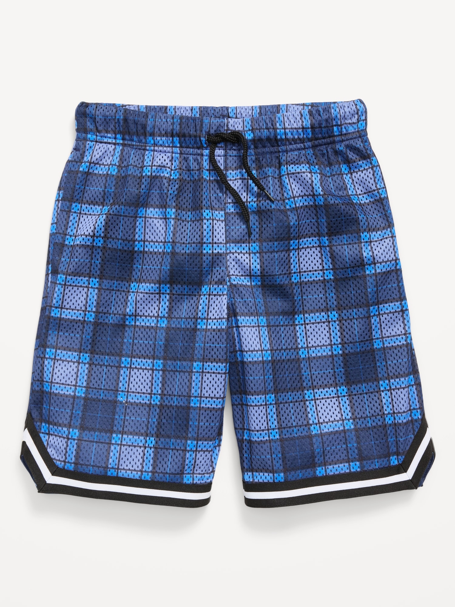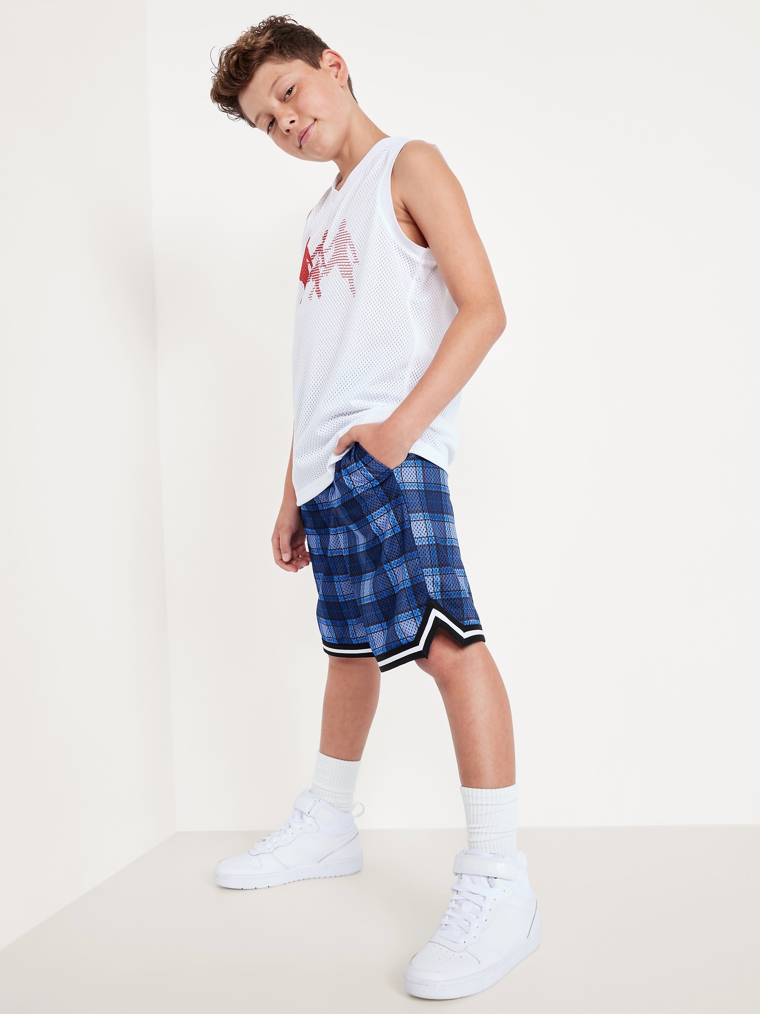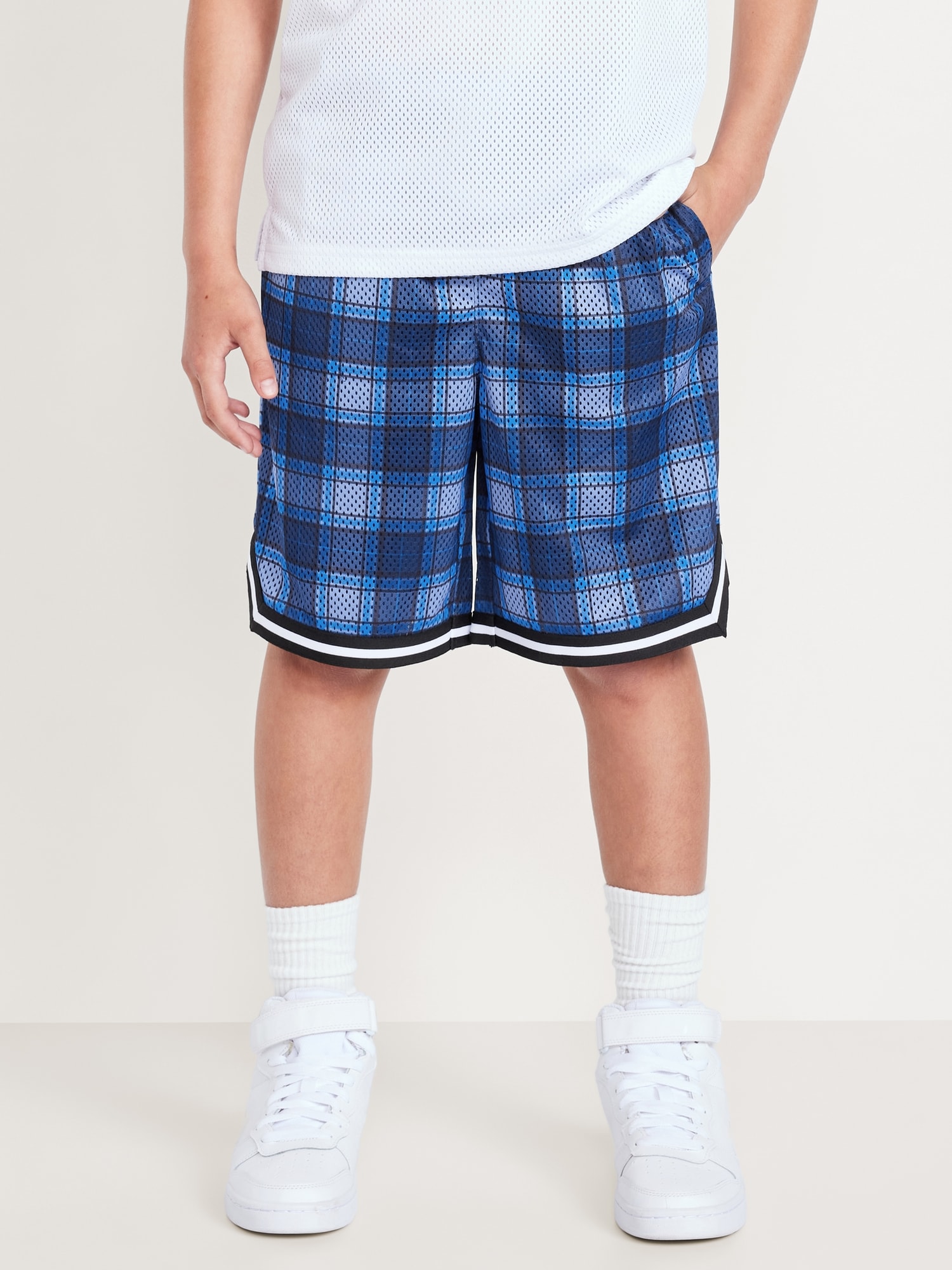 Knee Length Mesh Basketball Shorts for Boys: Made to keep up with all their shenanigans., Elasticized waistband, with adjustable drawstring., On-seam welt pockets., Retro striped tape trim at leg openings and vented sides., Breathable lightweight mesh lets him vent., Smooth, lightweight tricot lining., #875637