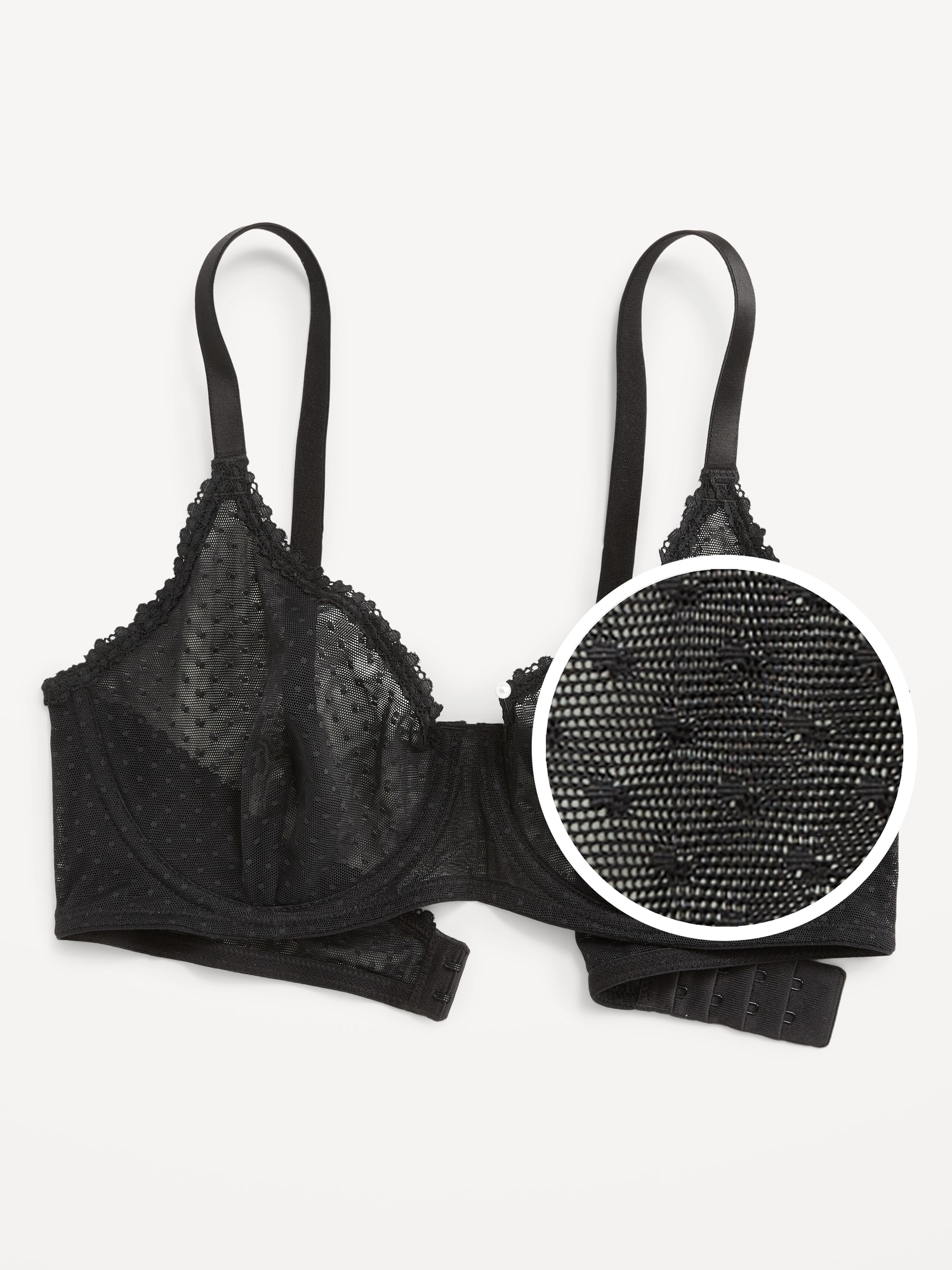 Lace-Trim Mesh-Dot Balconette Bra: lace trim, underwire support, back hook-and-eye closure, #800565