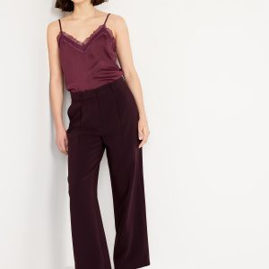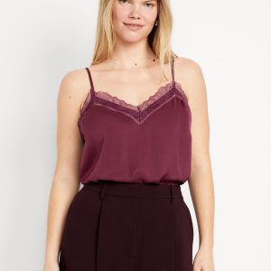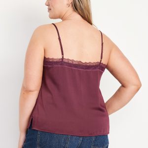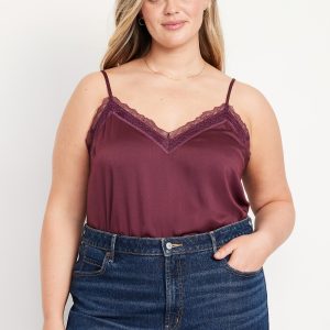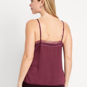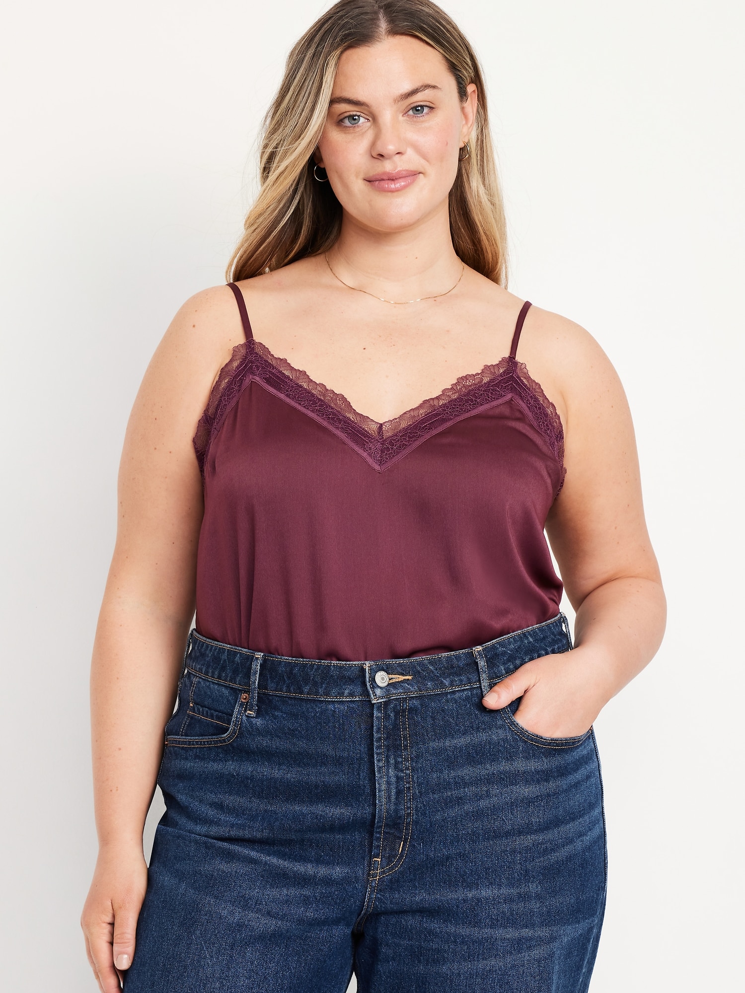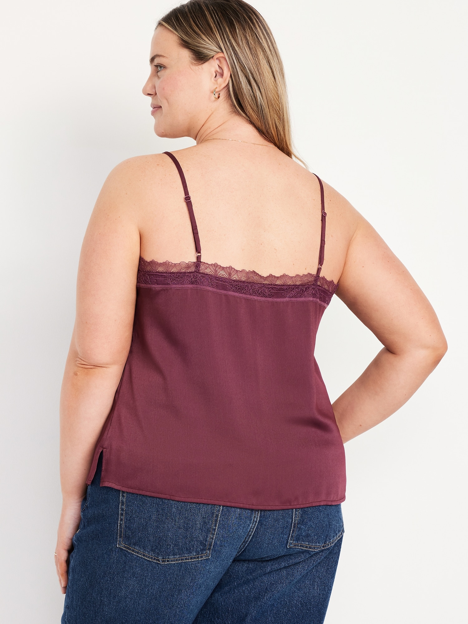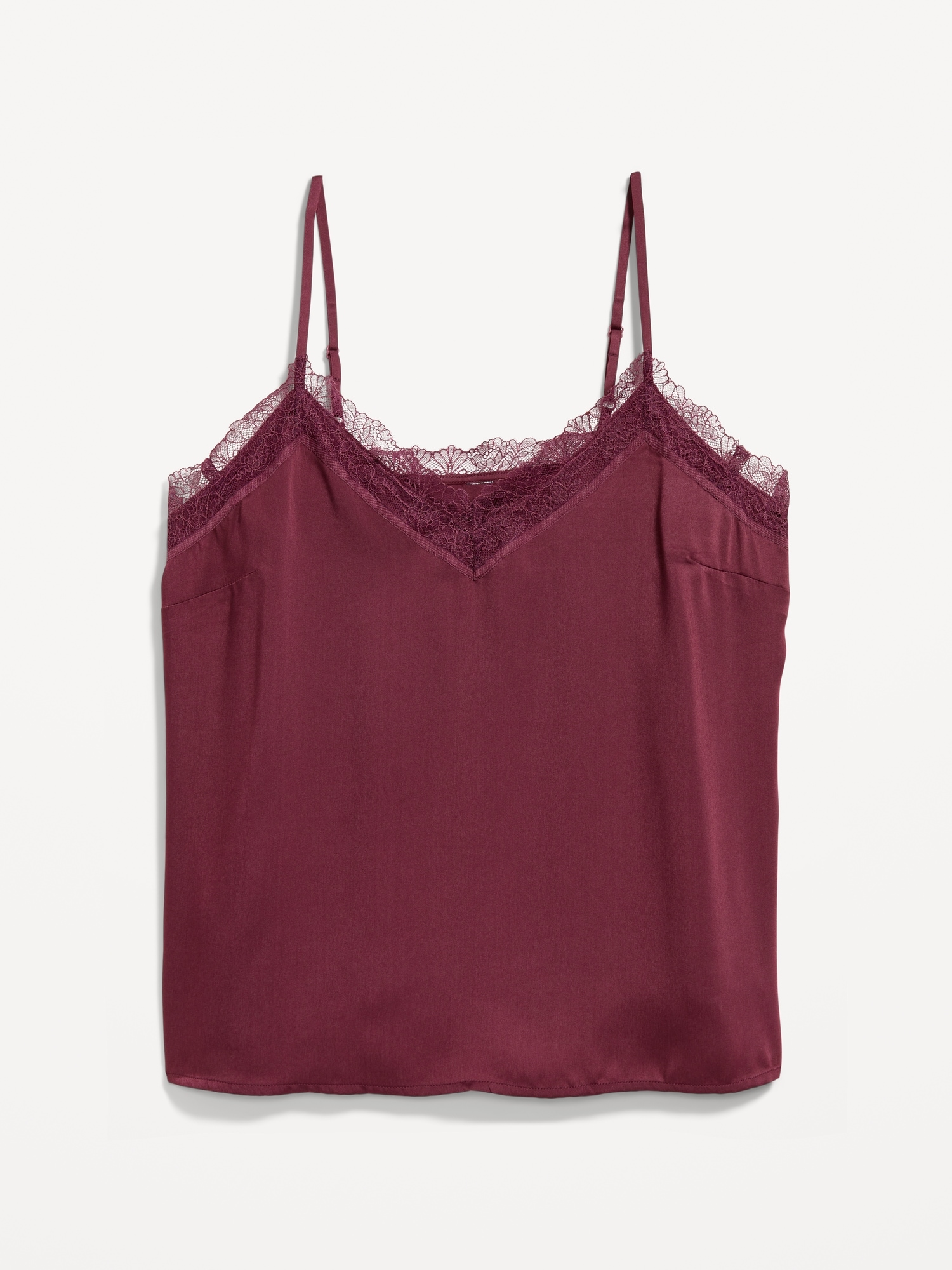 Lace-Trim Satin Cami Top: lace-trim v-neck, adjustable spaghetti straps, darted bust, #798427