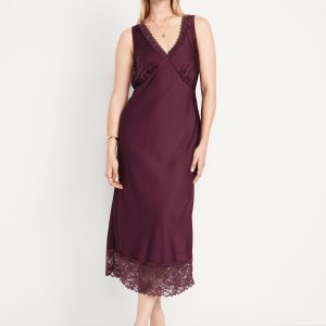 Lace-Trim Satin Midi Dress: lace-trim v-neck, sleeveless, seamed bodice, #798219