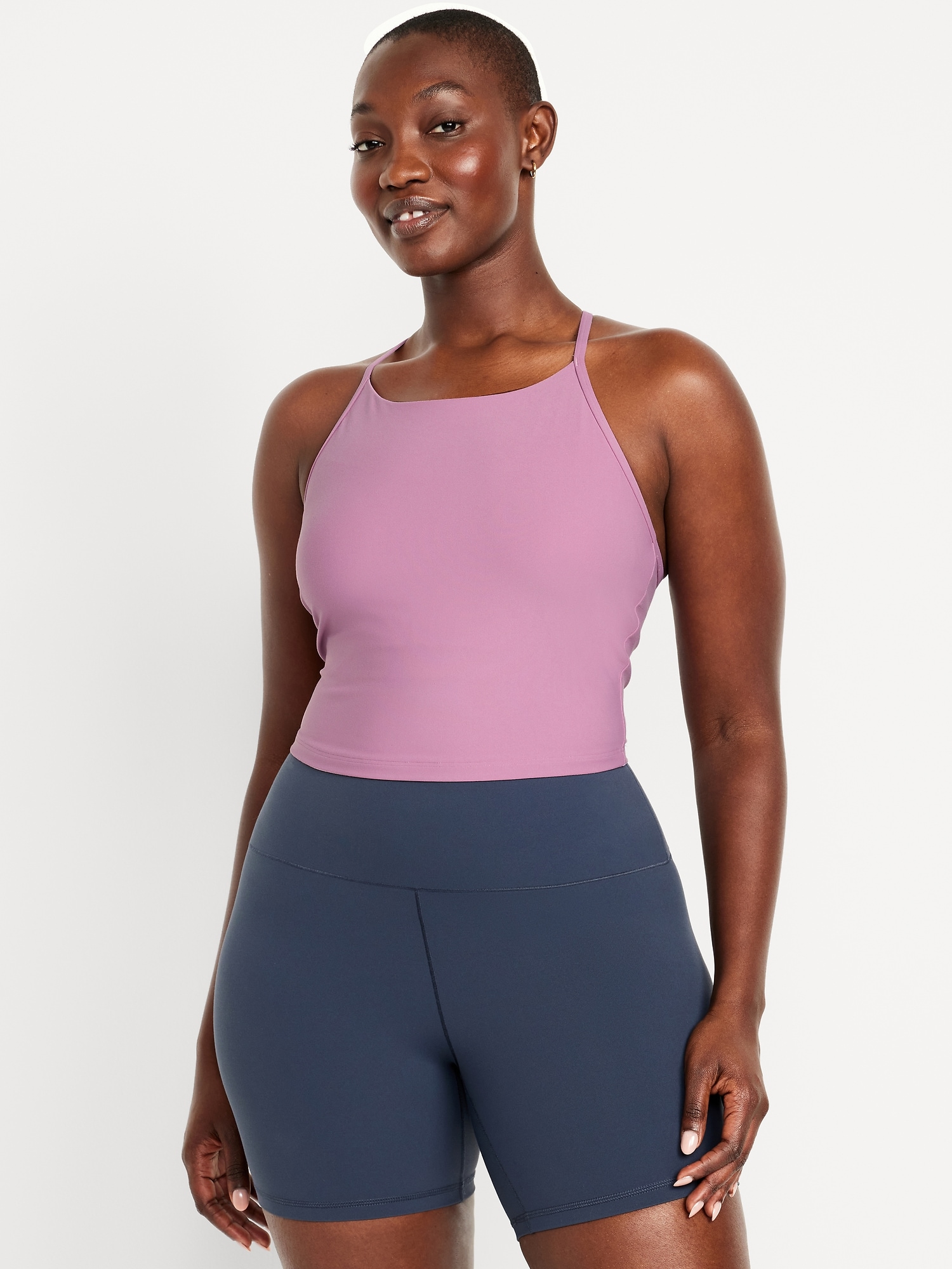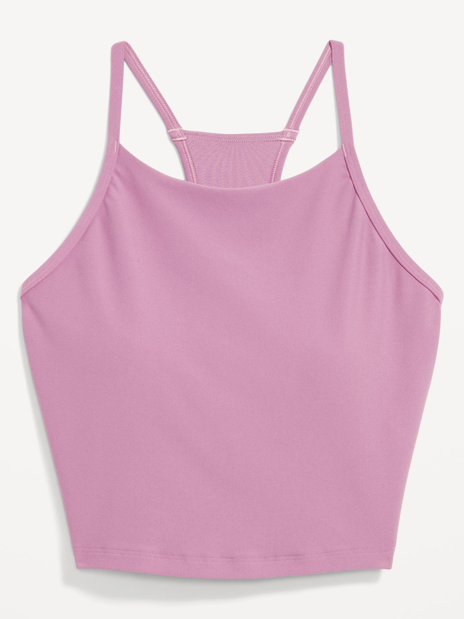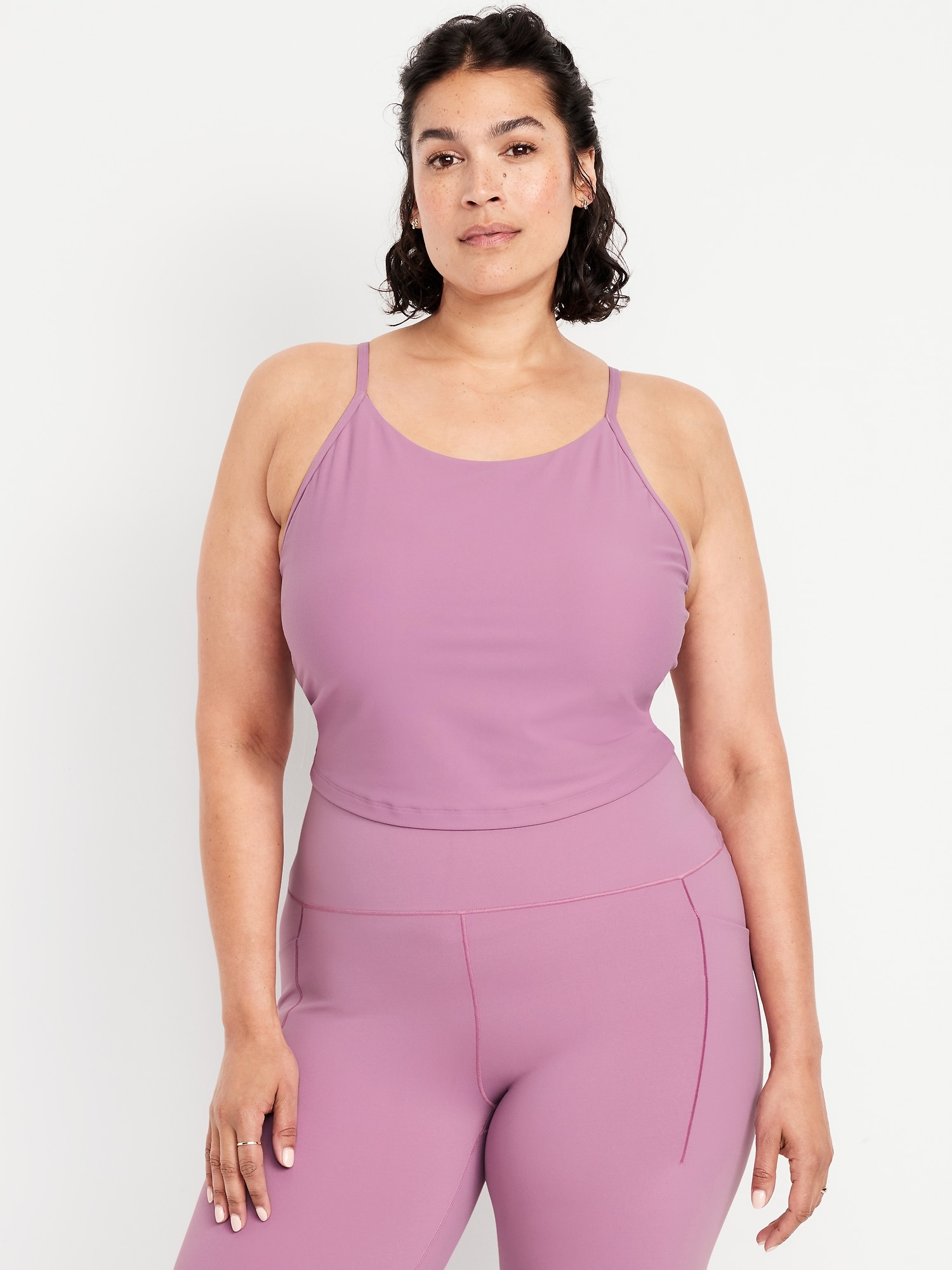 Light Support StudioSmooth Longline Sports Bra: Featuring StudioSmooth. Buttery soft and breathable, with a barely-there feel.high neck, spaghetti straps, removable pads, racerback, go-dry wicks moisture, #694514