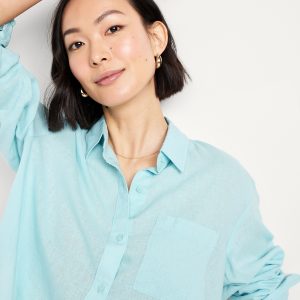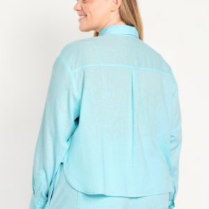 Linen-Blend Button-Down Crop Shirt: spread collar, long sleeves, buttoned cuffs, full-button front, patch chest pocket, #760758