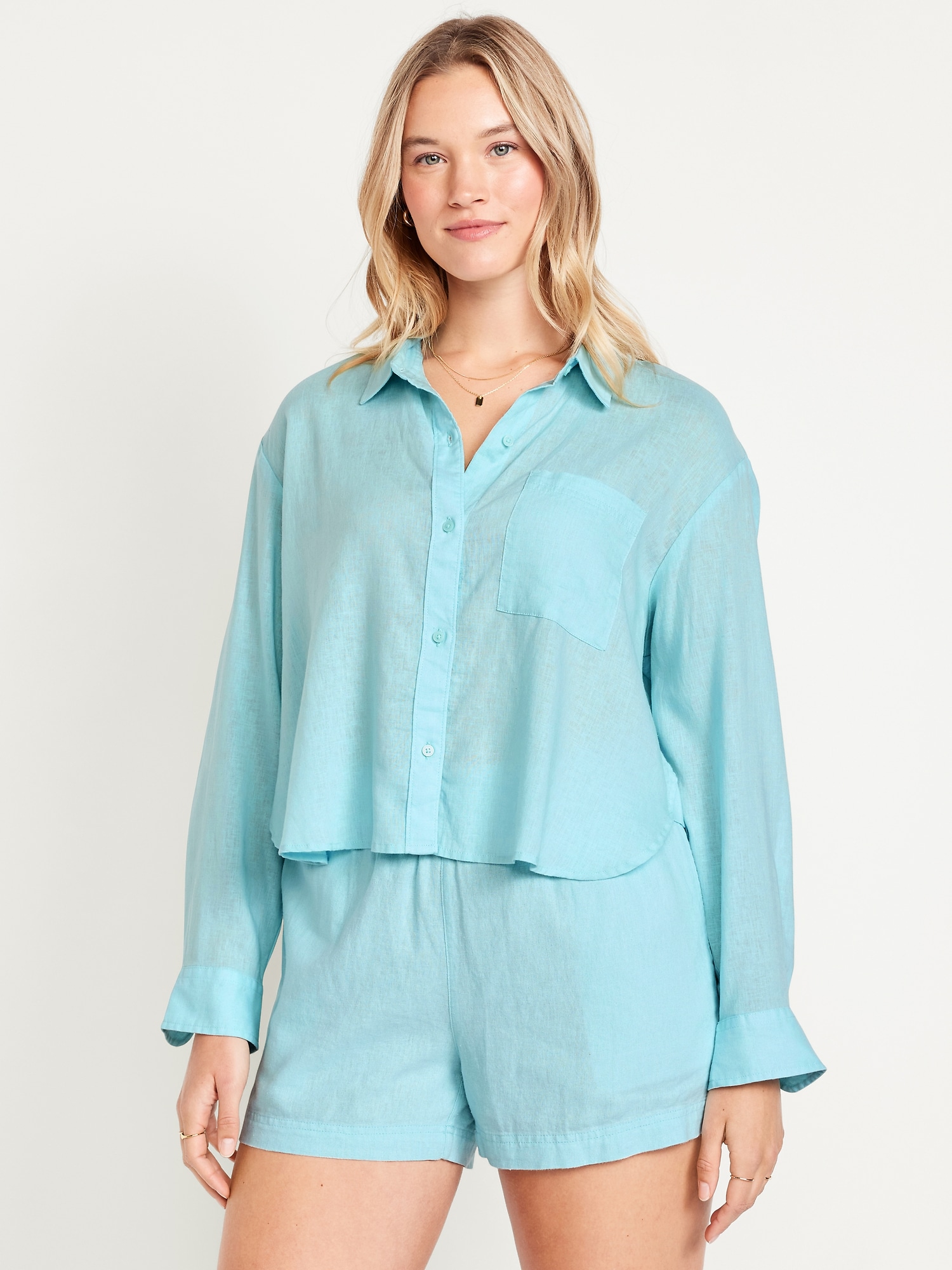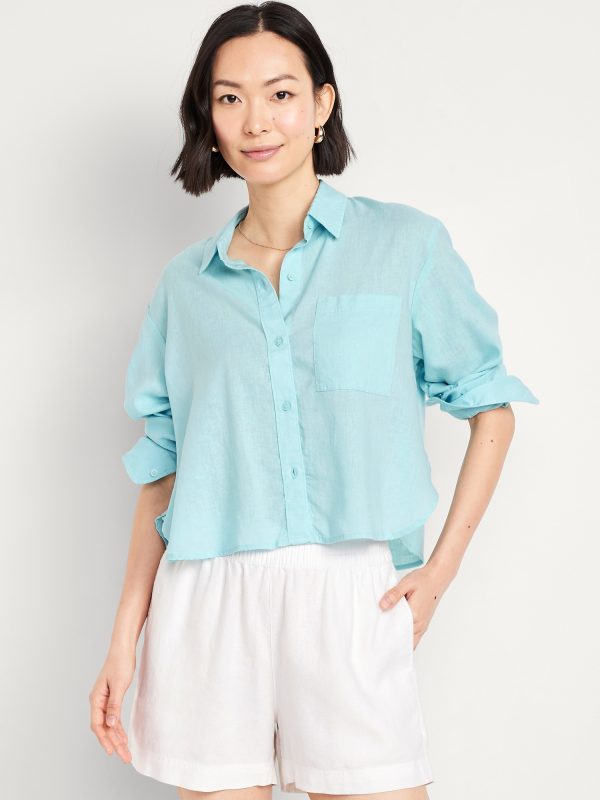 Linen-Blend Button-Down Crop Shirt: spread collar, long sleeves, buttoned cuffs, full-button front, patch chest pocket, #760758