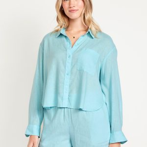 Linen-Blend Button-Down Crop Shirt: spread collar, long sleeves, buttoned cuffs, full-button front, patch chest pocket, #760758