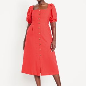 Linen-Blend Button-Front Midi Dress: square neck, short puff sleeves, full-button front, diagonal hip pockets, smocked back, #705471