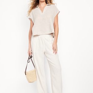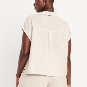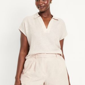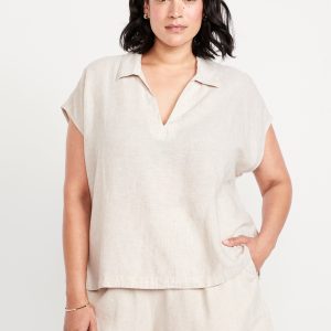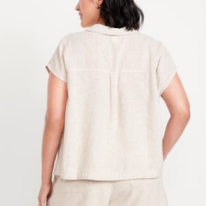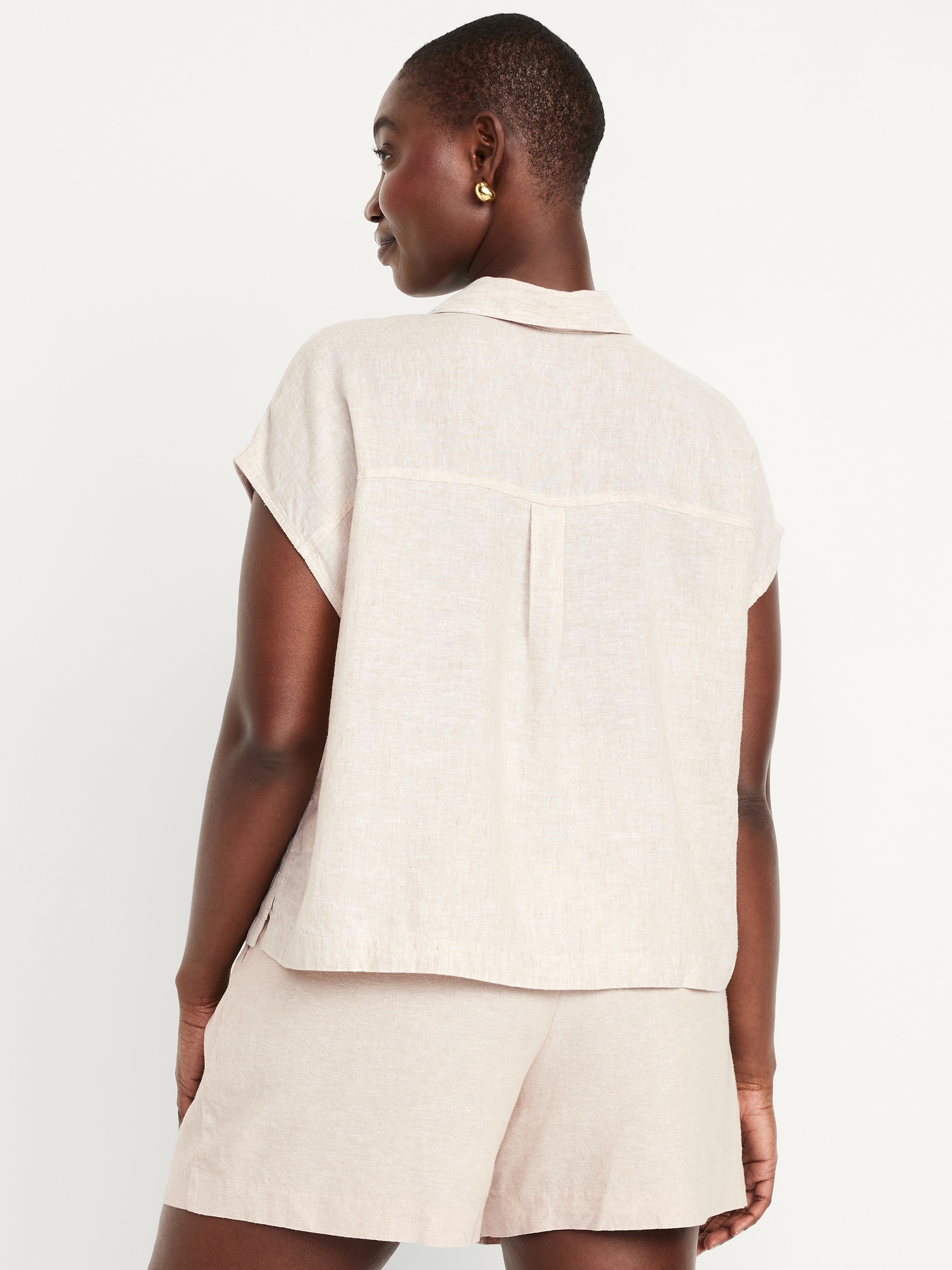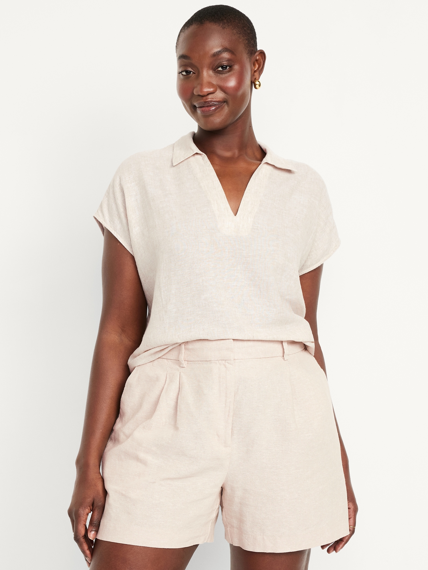 Linen-Blend Cropped Popover Shirt: spread v-neck collar, short dolman sleeves, seamed back yoke, easy popover style, #764183