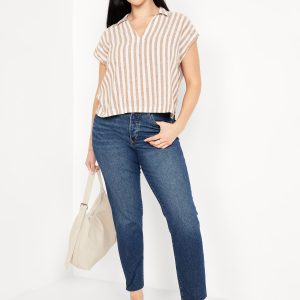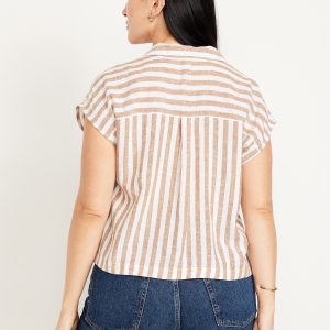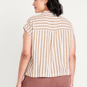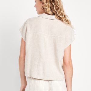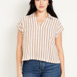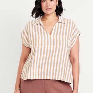 Linen-Blend Cropped Popover Shirt: spread v-neck collar, short dolman sleeves, seamed back yoke, easy popover style, #764183