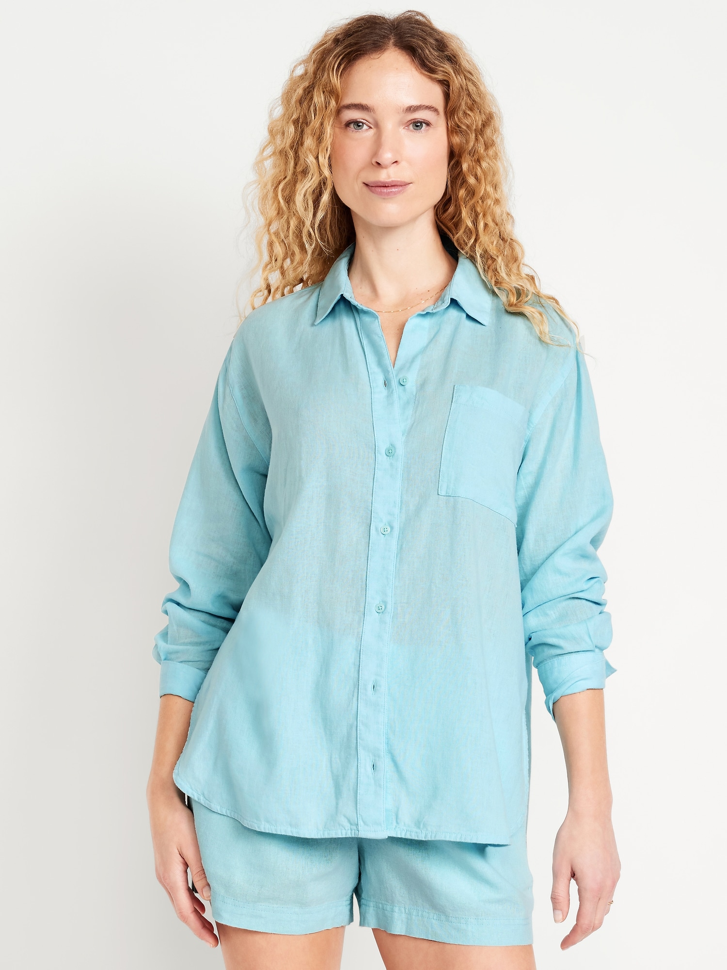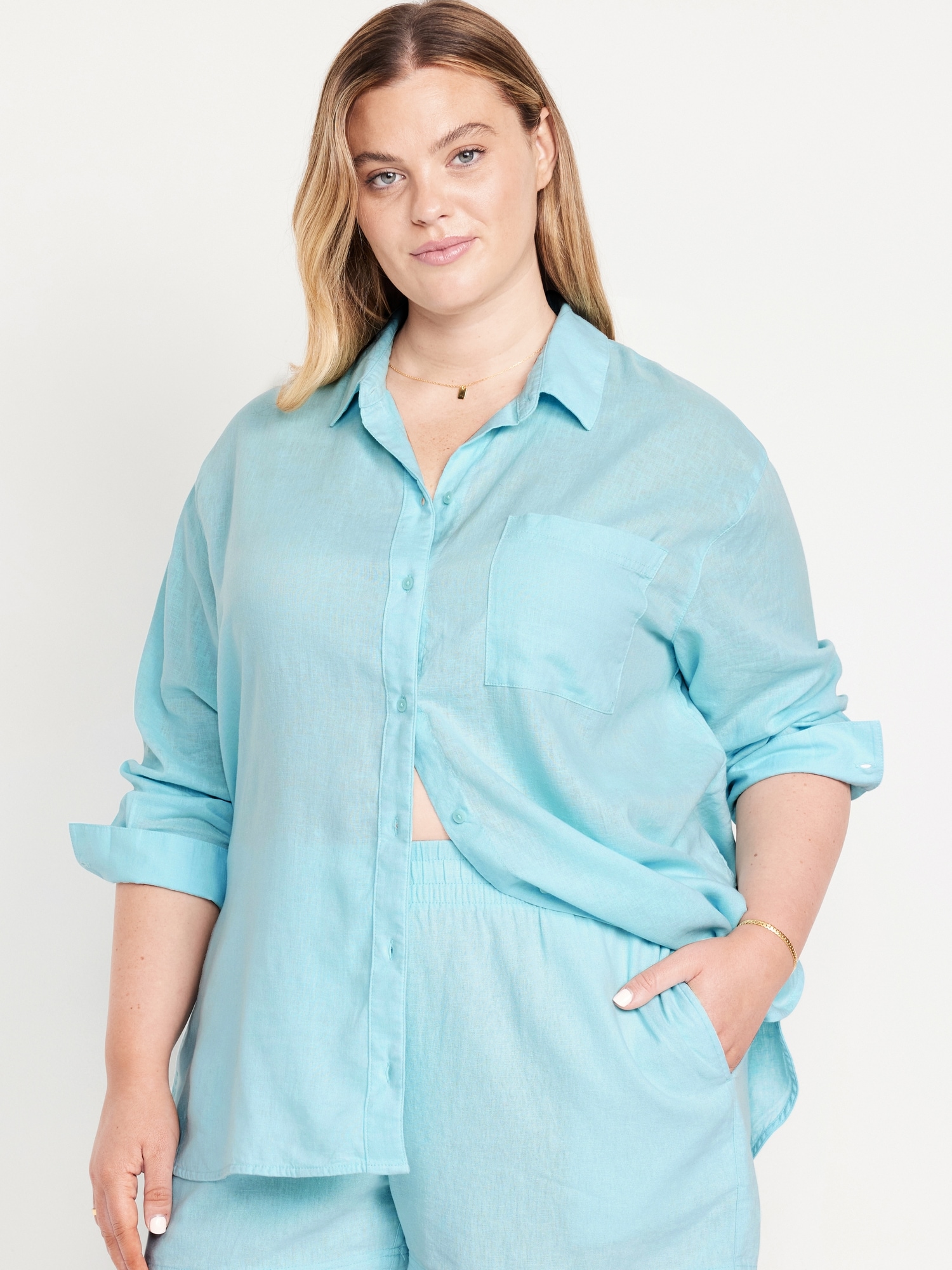 Linen-Blend Loose Button-Down Shirt: spread collar, long sleeves, buttoned cuffs, full-button front, patch chest pocket, curved hi-lo hem, all-over sun print, #745082