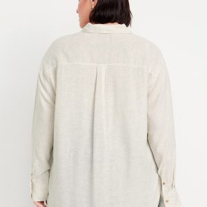 Linen-Blend Loose Button-Down Shirt: spread collar, long sleeves, buttoned cuffs, full-button front, patch chest pocket, curved hi-lo hem, all-over sun print, #745082