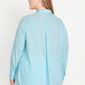 Linen-Blend Loose Button-Down Shirt: spread collar, long sleeves, buttoned cuffs, patch chest pocket, full-button front, striped print, curved hi-lo hem, #693623