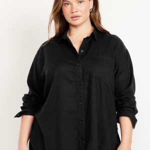 Button-Down Linen-Blend Striped Shirt: spread collar, long sleeves, buttoned cuffs, patch chest pocket, full-button front, striped print, curved hi-lo hem, #693623