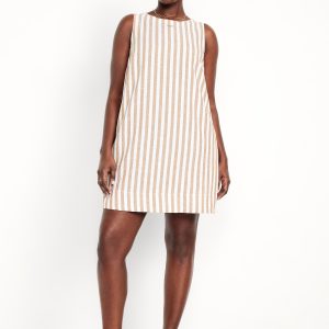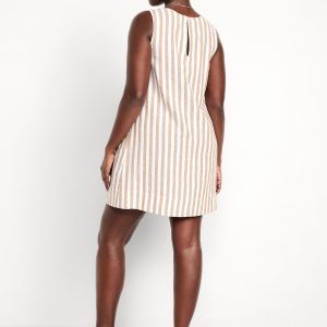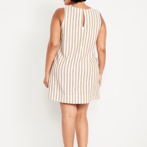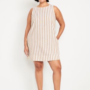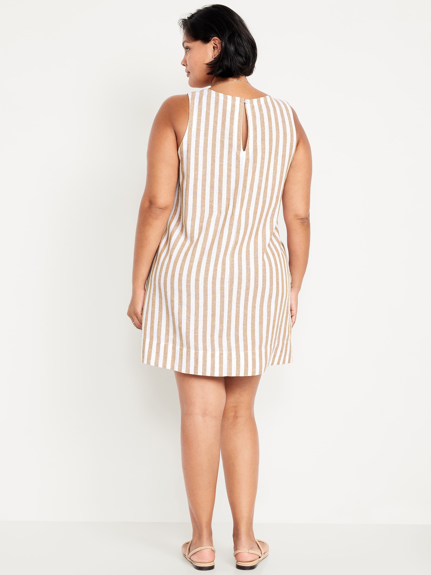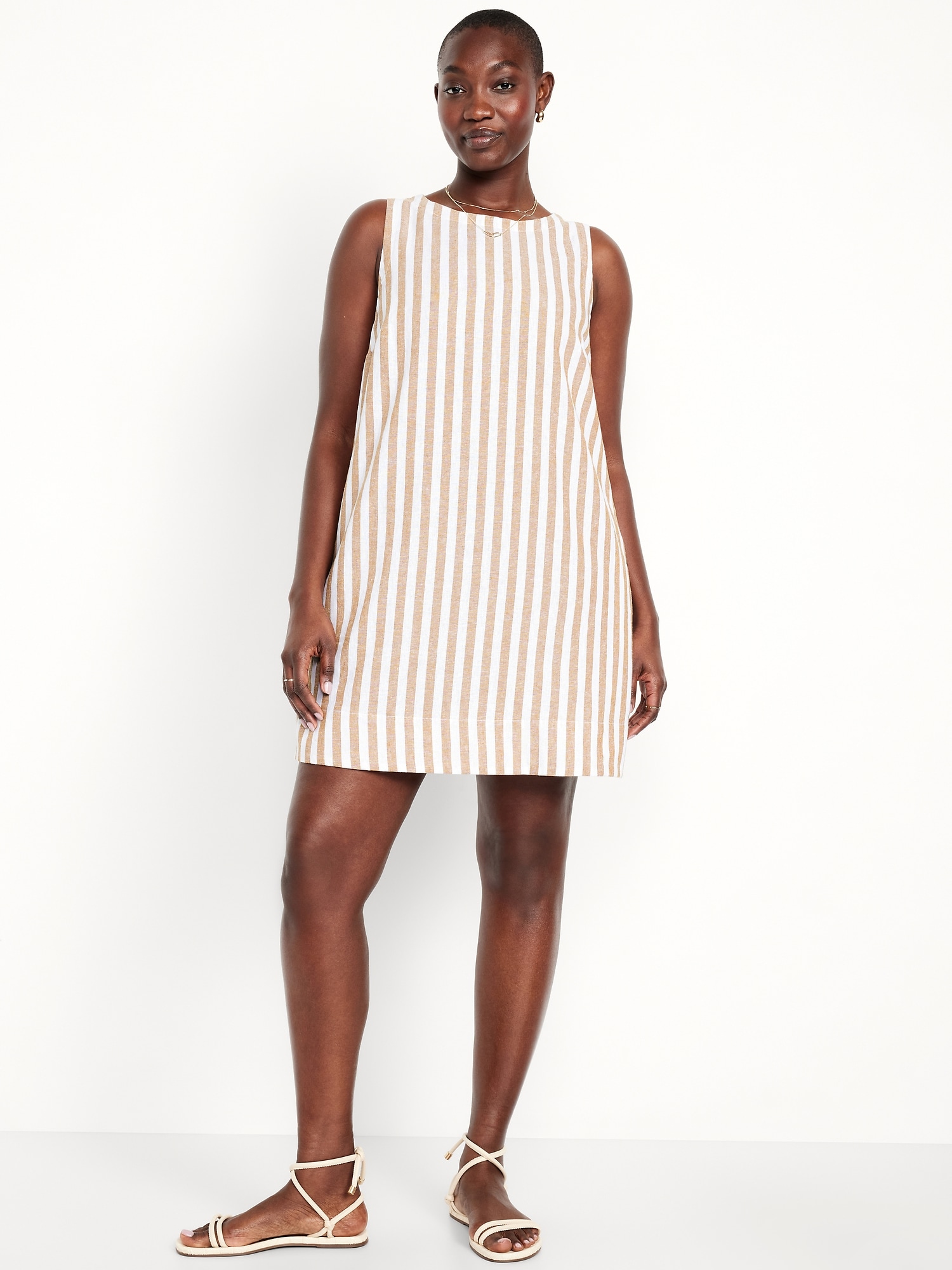 Linen-Blend Mini Shift Dress: high neck, sleeveless, side-seam pockets, button-loop closure at nape, darted bust, all-over floral and fruit print, #766928