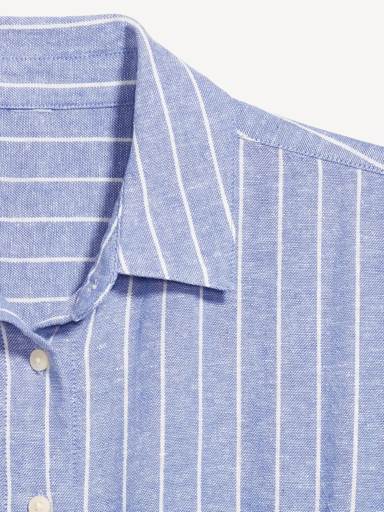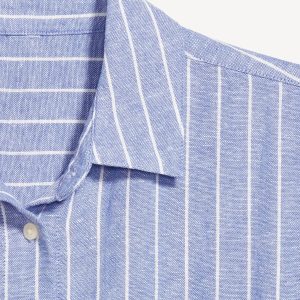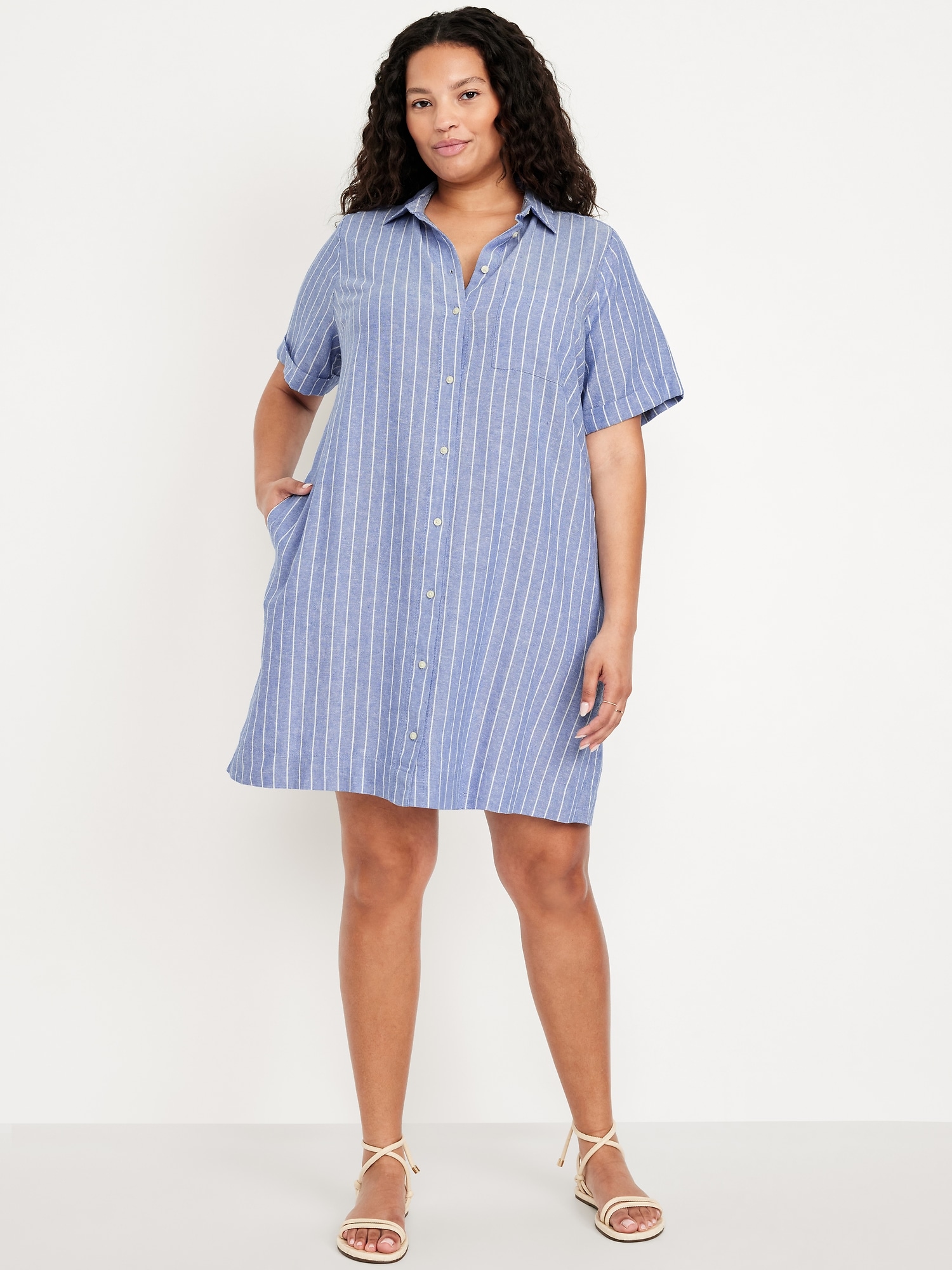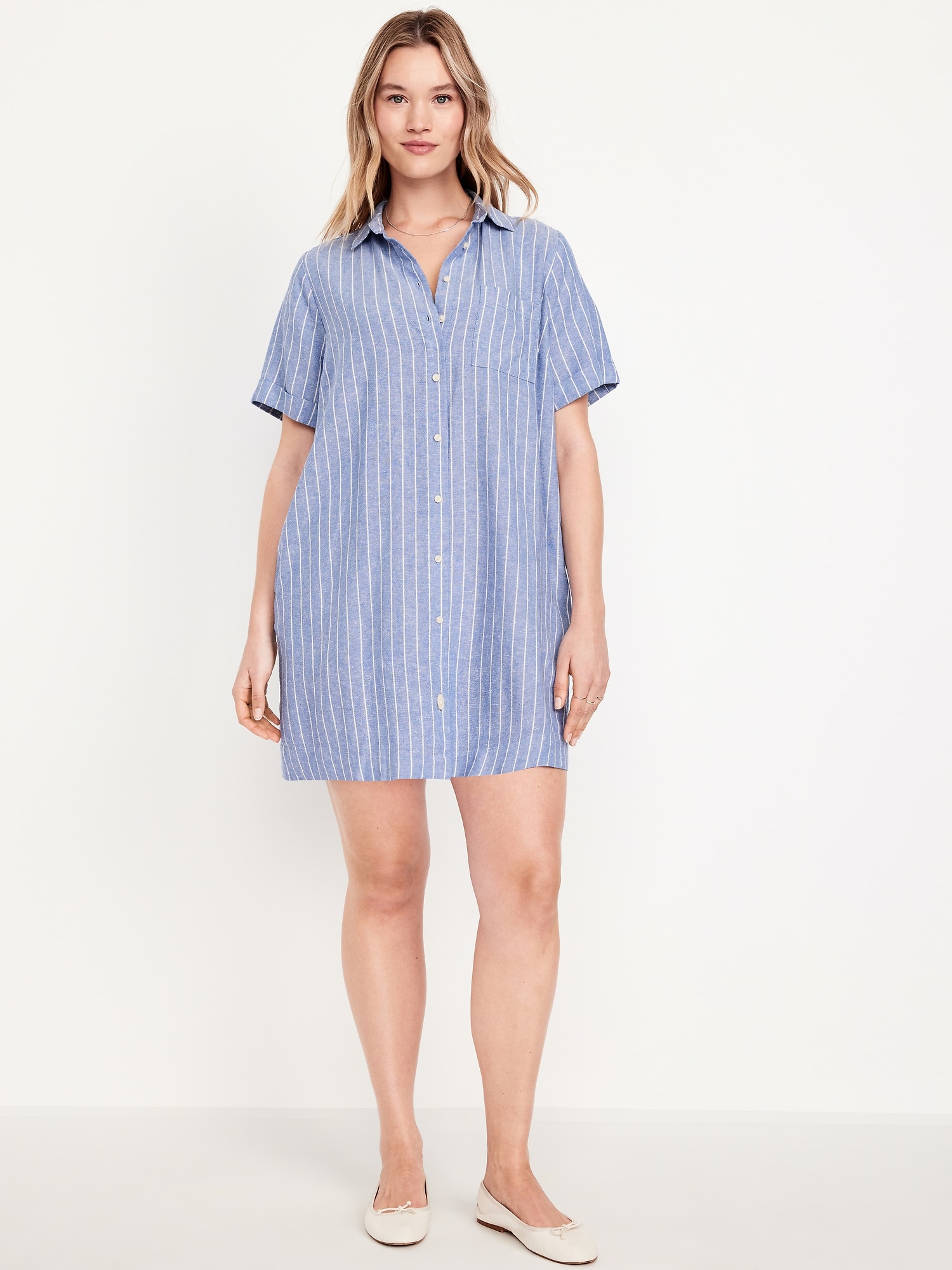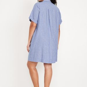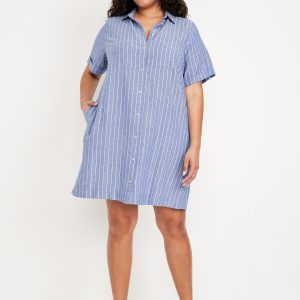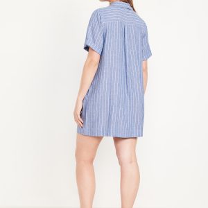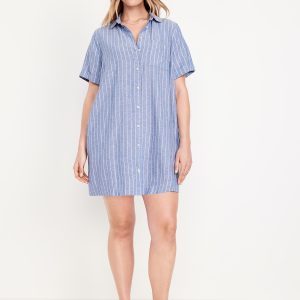 Linen-Blend Mini Shirt Dress: spread collar, short sleeves, full-button front, patch chest pocket, striped print, #766933