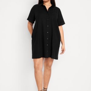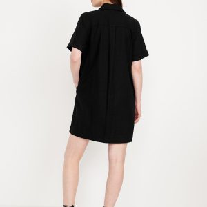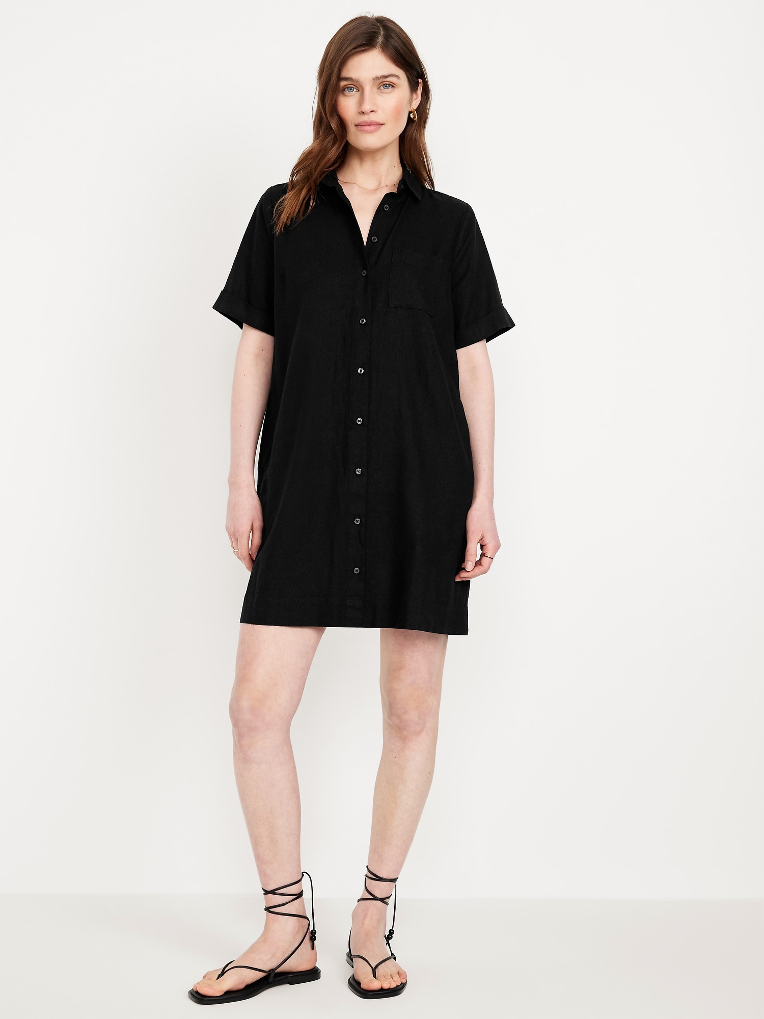 Linen-Blend Shirt Dress: spread collar, short sleeves, full-button front, patch chest pocket, striped print, #766933