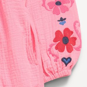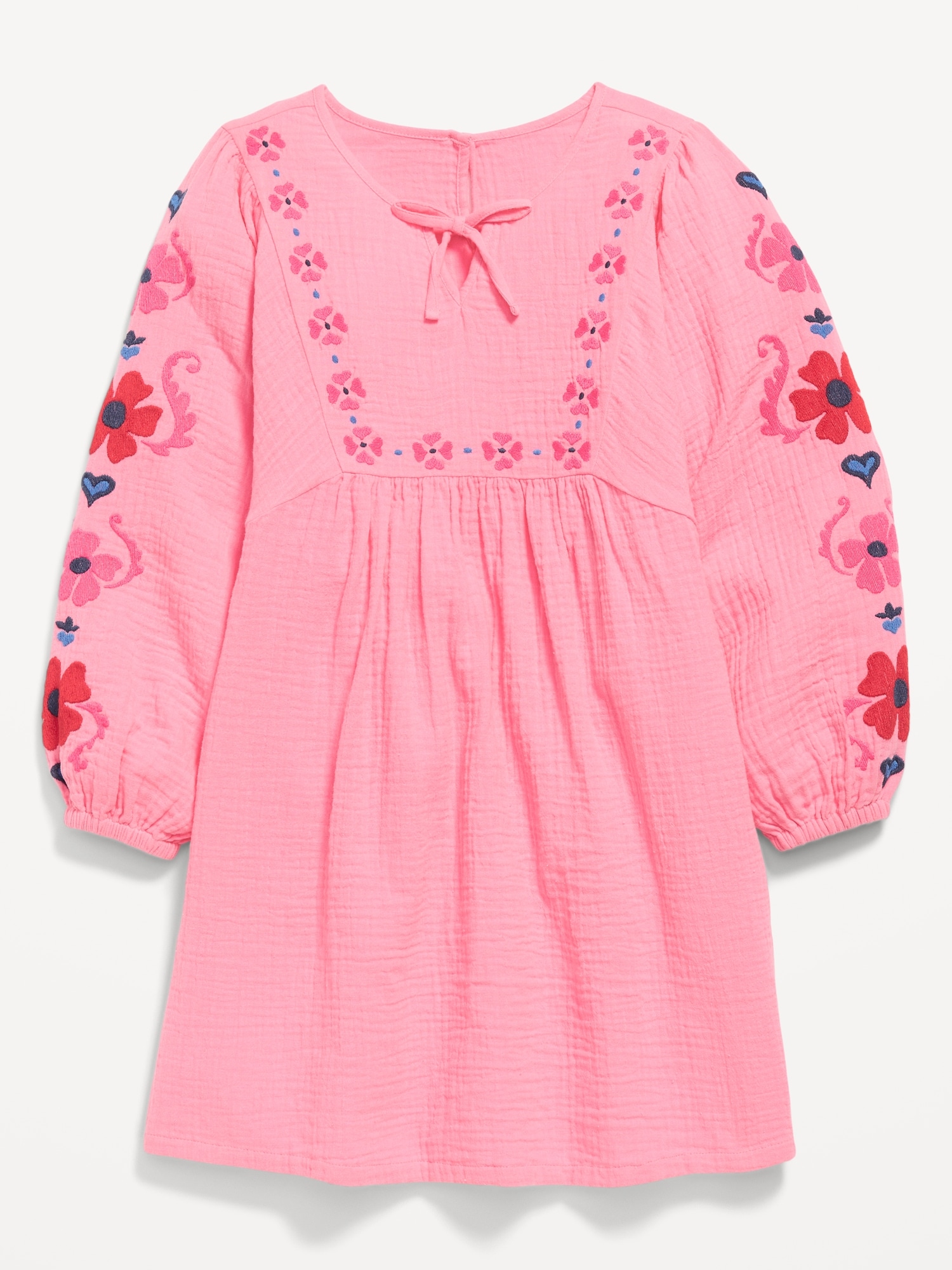 Long-Sleeve Double-Weave Embroidered Swing Dress for Girls