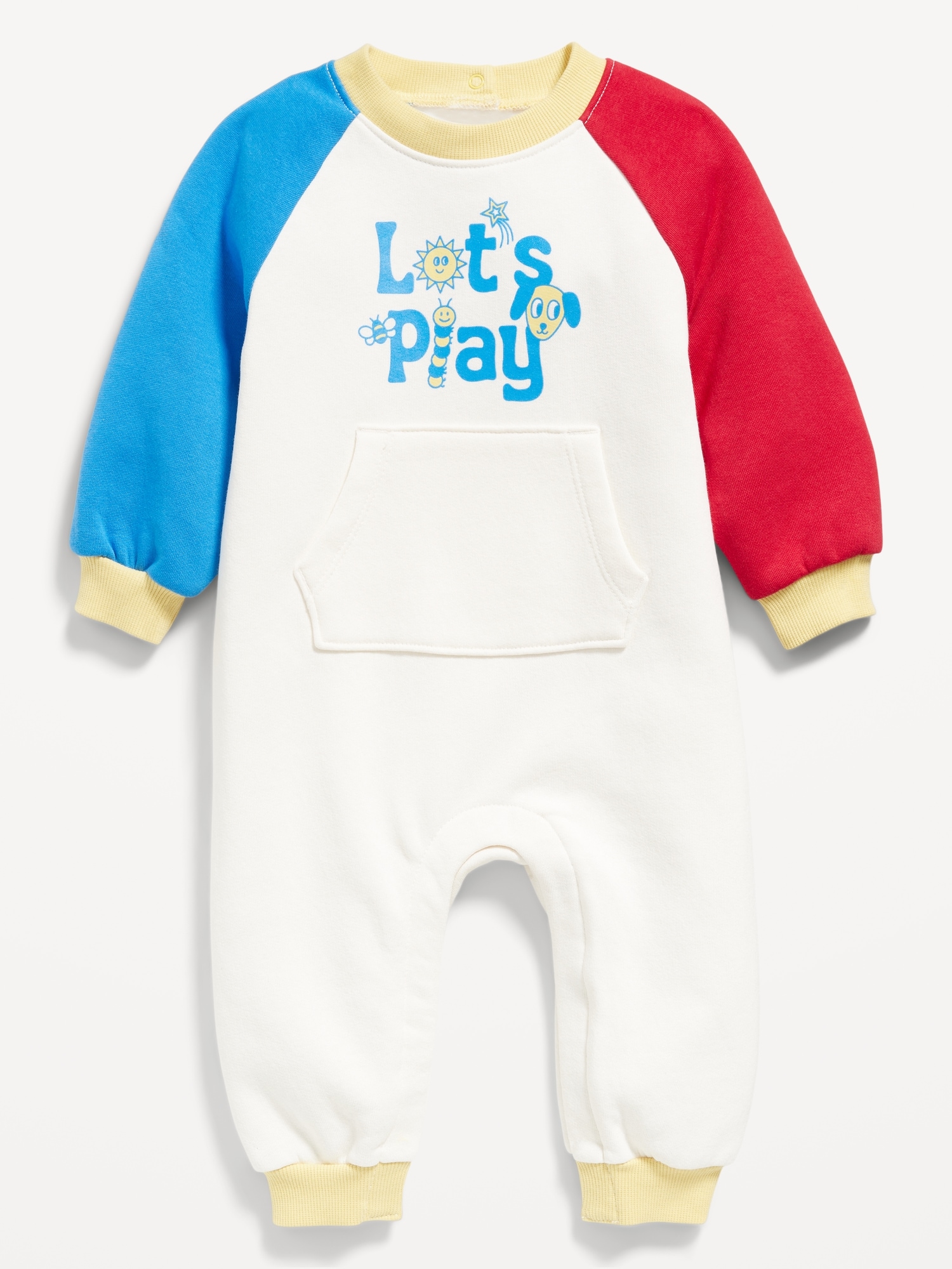 Long-Sleeve Fleece One-Piece Jumpsuit for Baby: crew neck, long sleeves, snap-button placket at nape, kangaroo pocket, hidden snaps along inseam, #802627