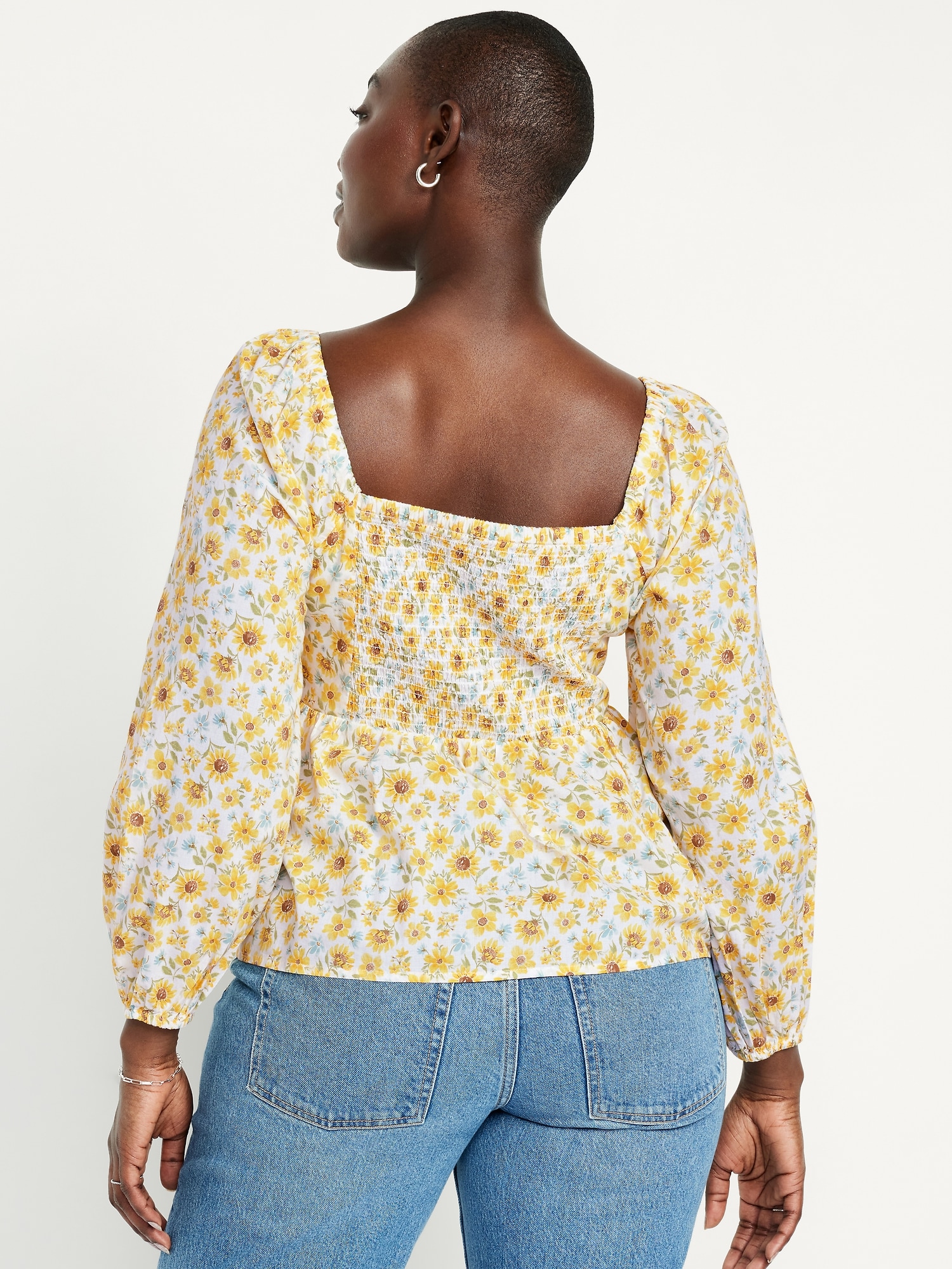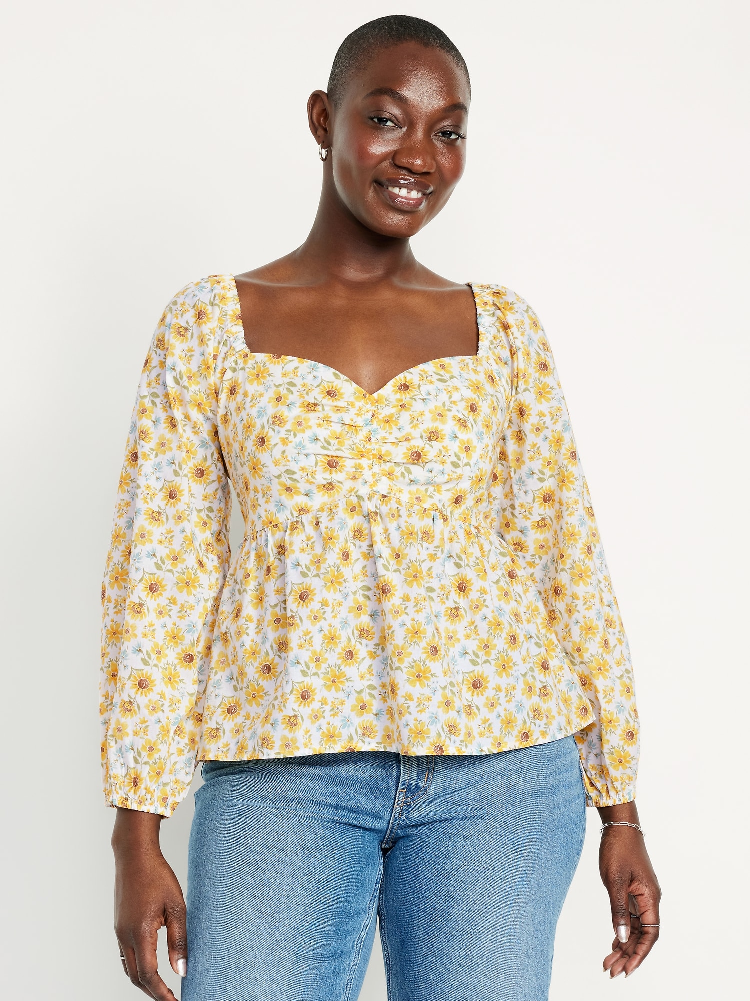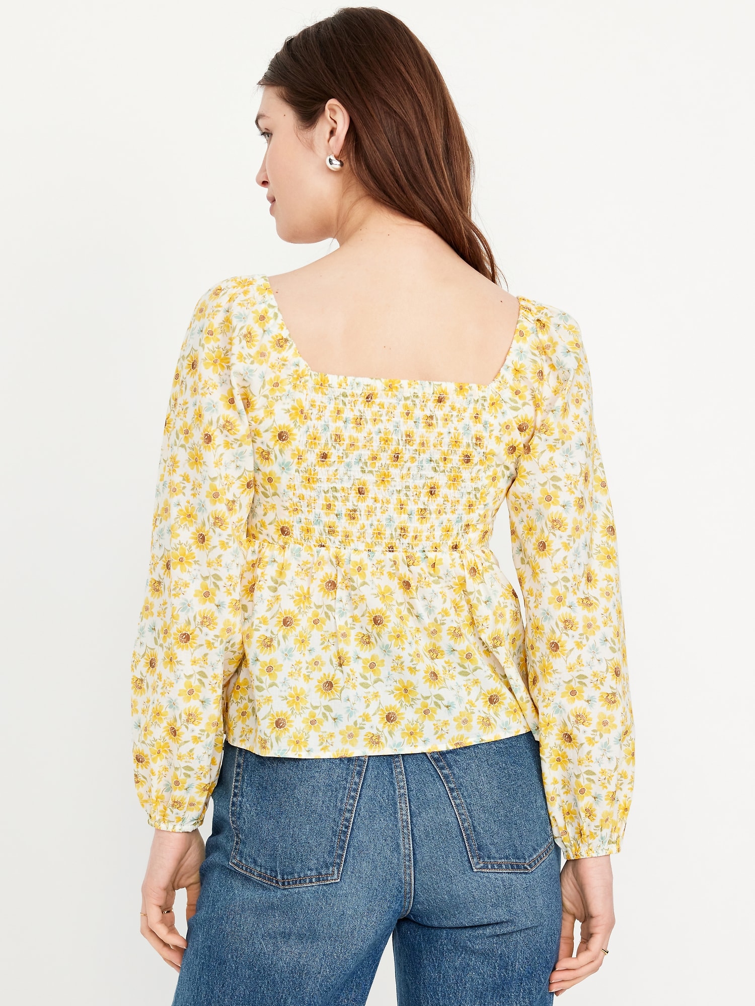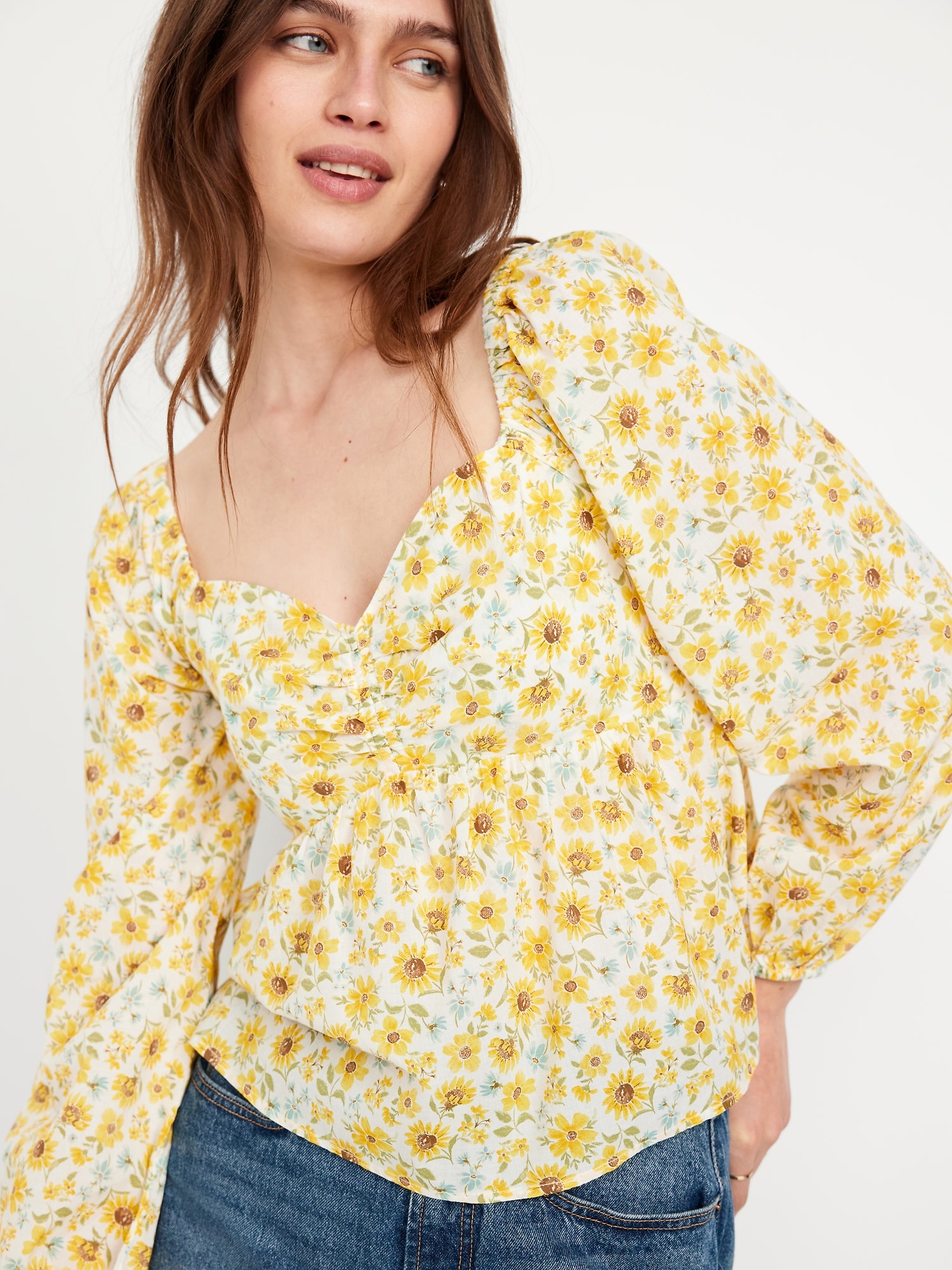 Long-Sleeve Floral Top: sweetheart neckline, long sleeves, elastic cuffs, smocked back, striped print, #704104