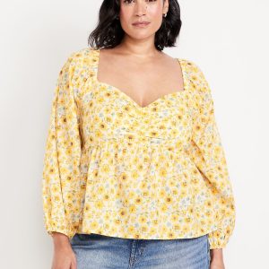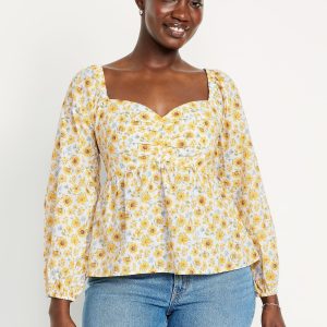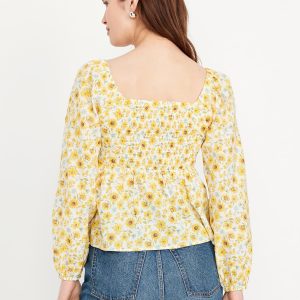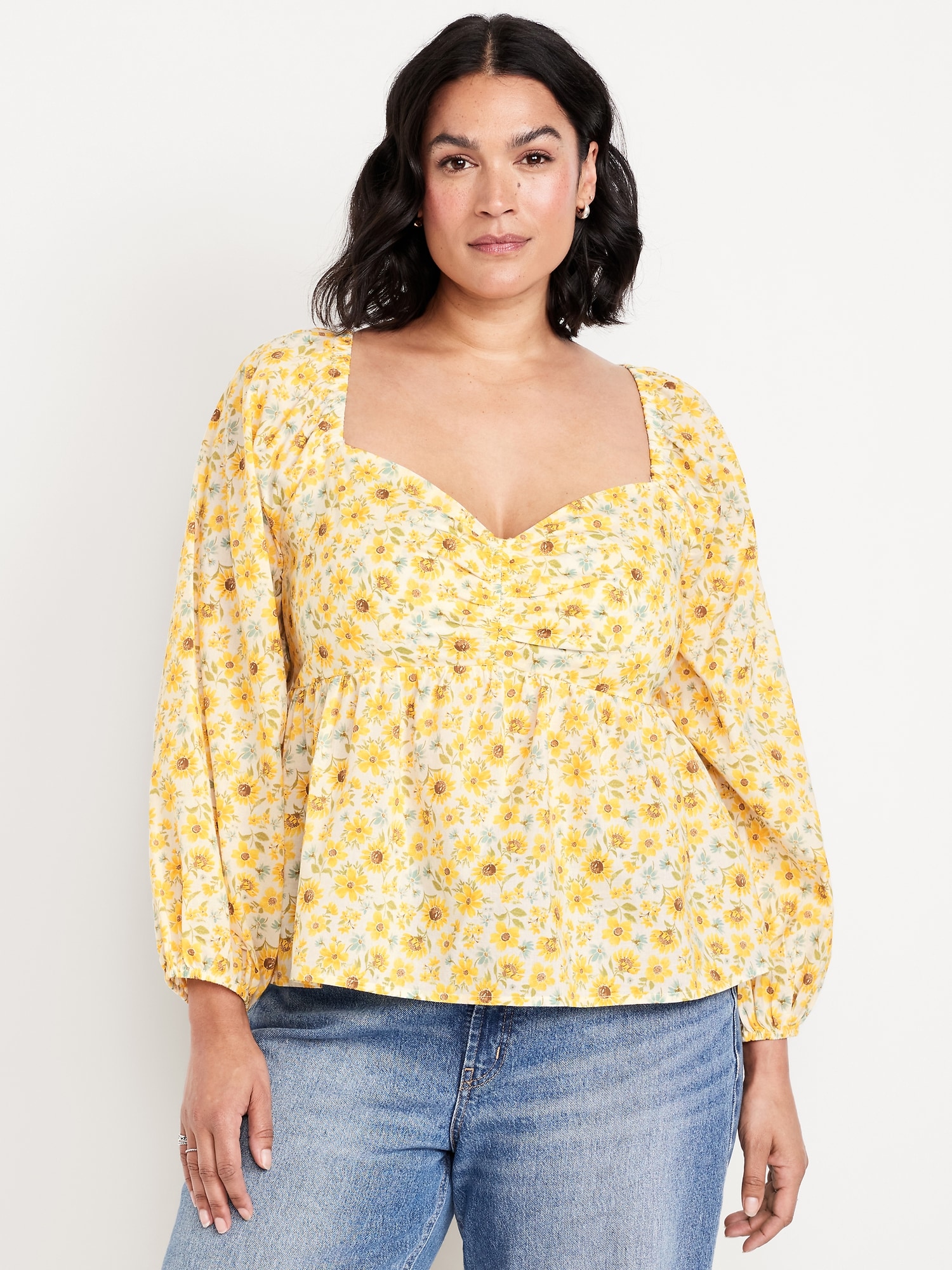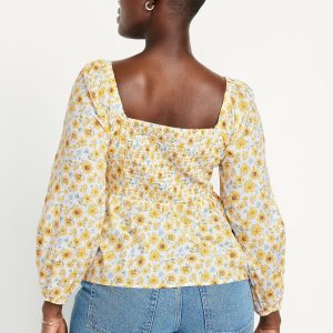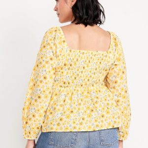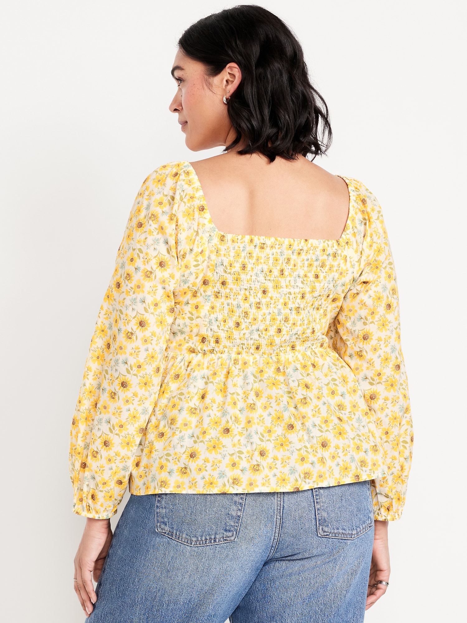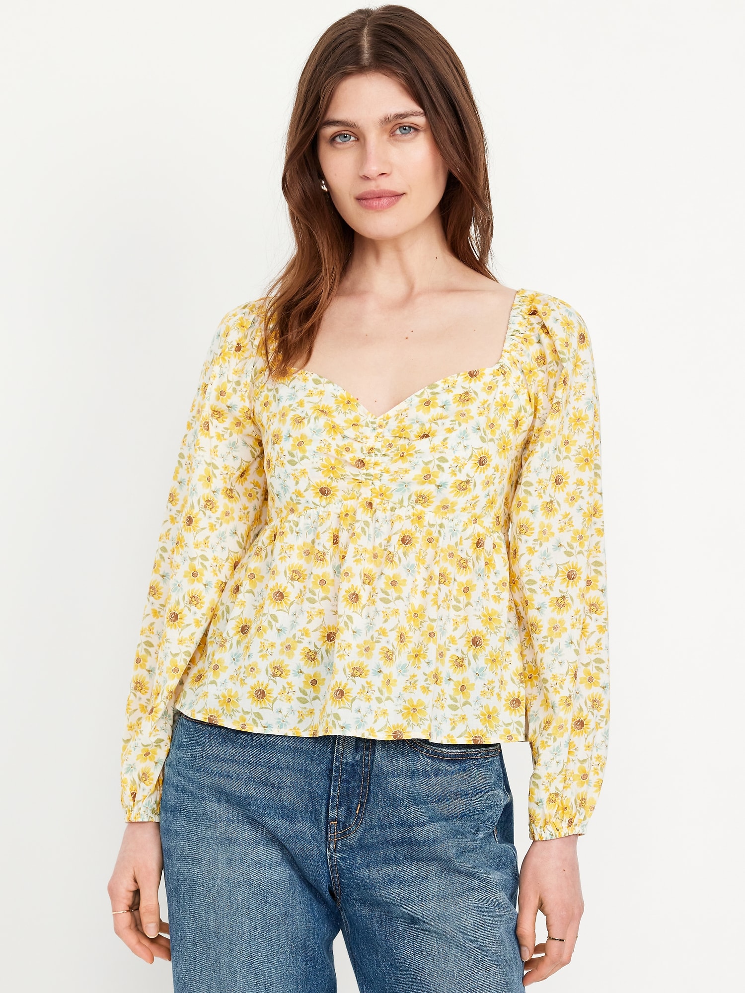 Long-Sleeve Floral Top: sweetheart neckline, long sleeves, elastic cuffs, smocked back, striped print, #704104