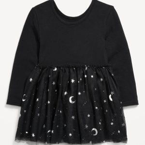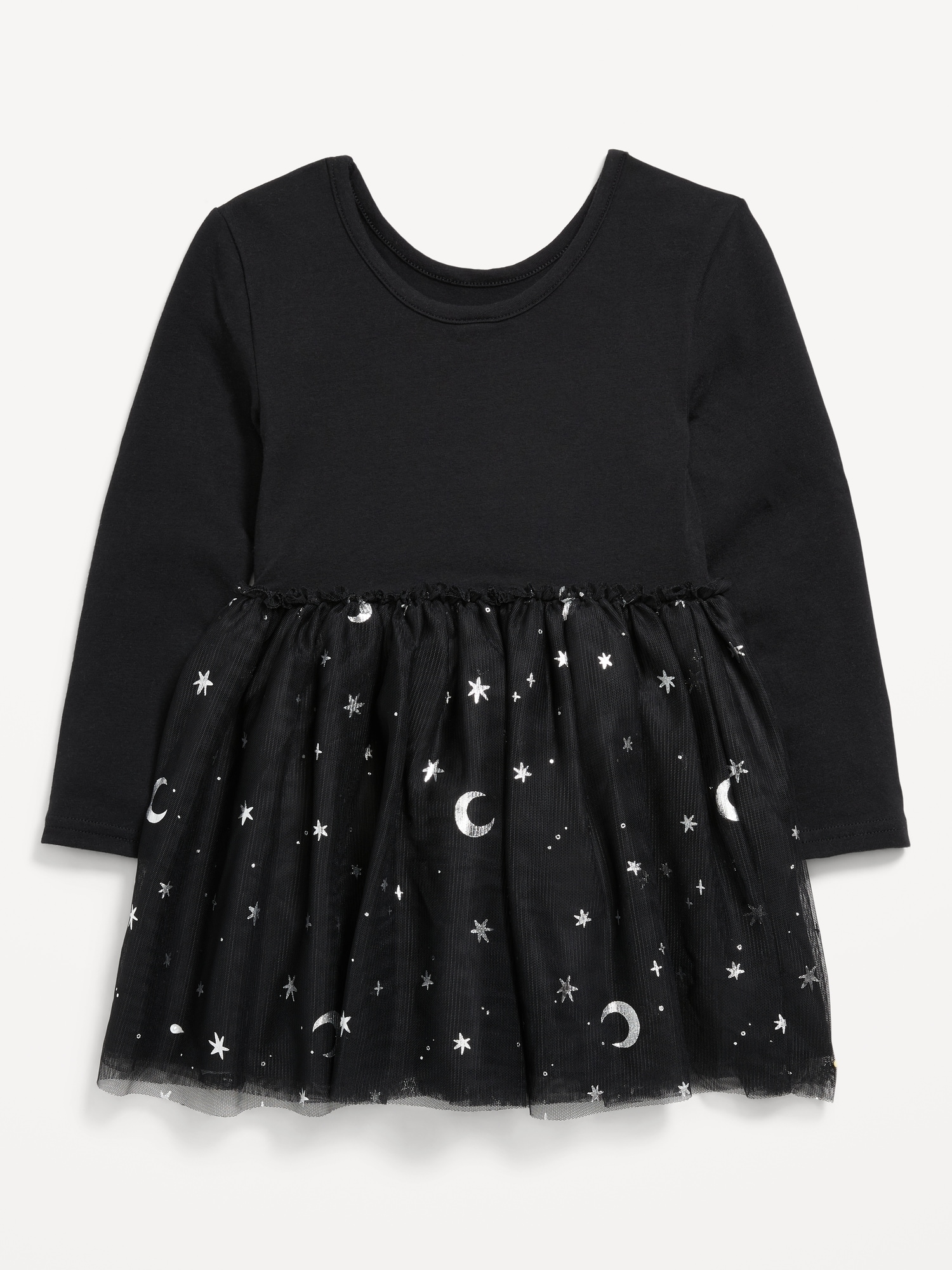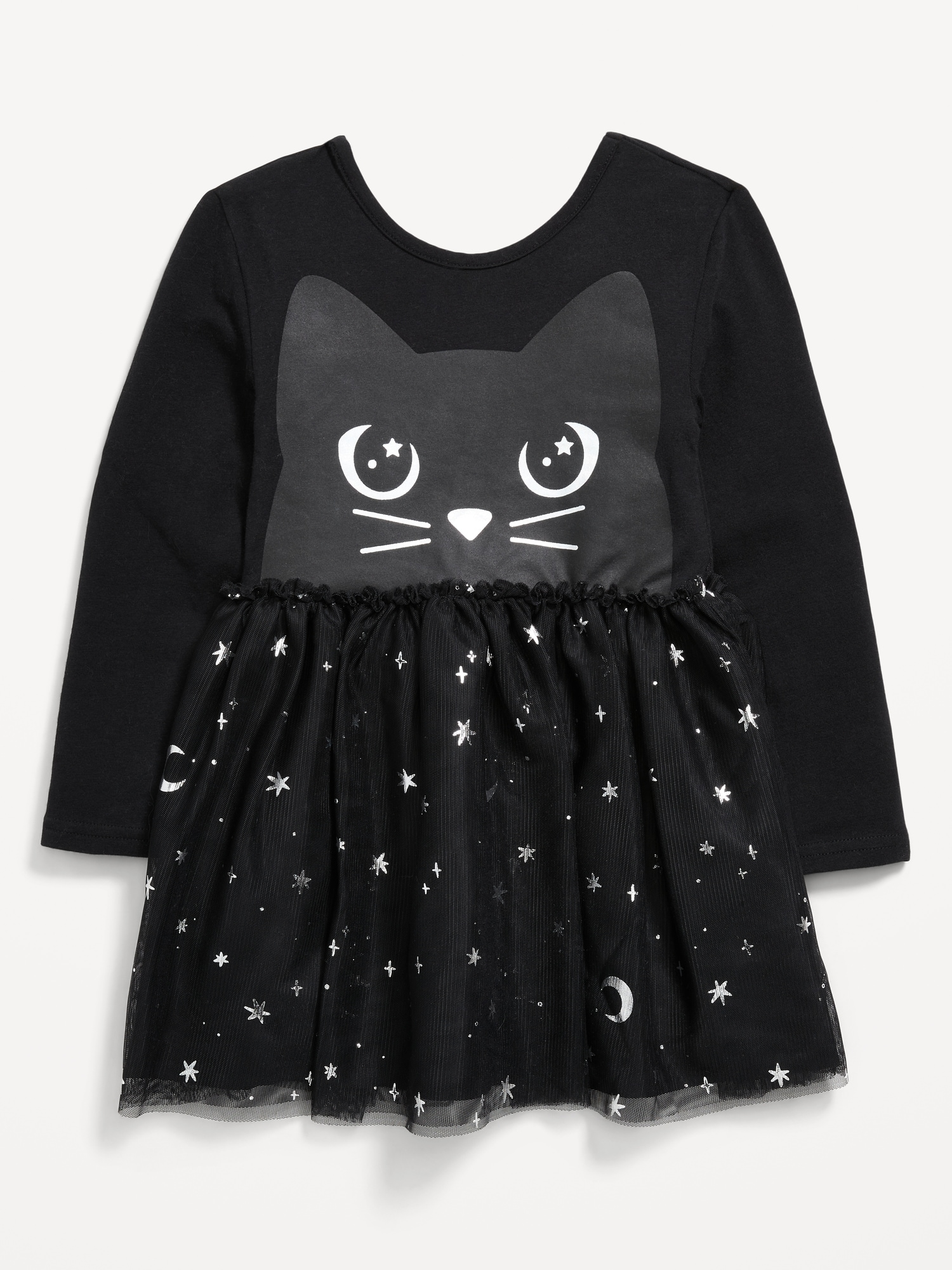 Long-Sleeve Halloween Tutu Dress for Toddler Girls: scoop neck, long sleeves, deep scoop back, graphic at front, seamed ruffled waist, flared tutu skirt, lightweight tulle mesh layers, #801317