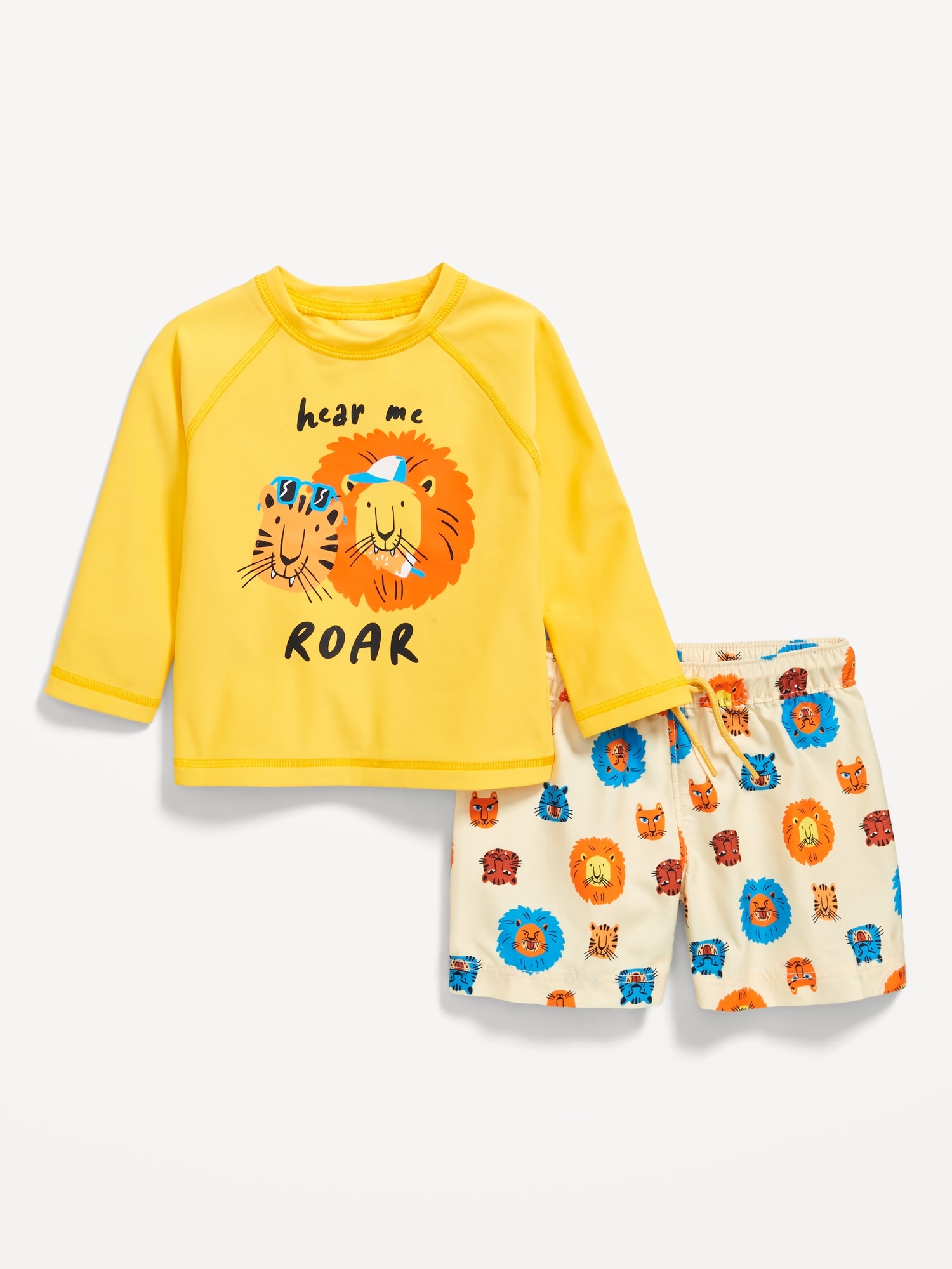 Long-Sleeve Rashguard Swim Top and Shorts Set for Baby: pack includes a rashguard swim top and coordinating swim trunks, crew neck, long raglan sleeves, coordinating swim trunks have elasticized, functional-drawstring waist, single patch pocket at back, online exclusive, #859270