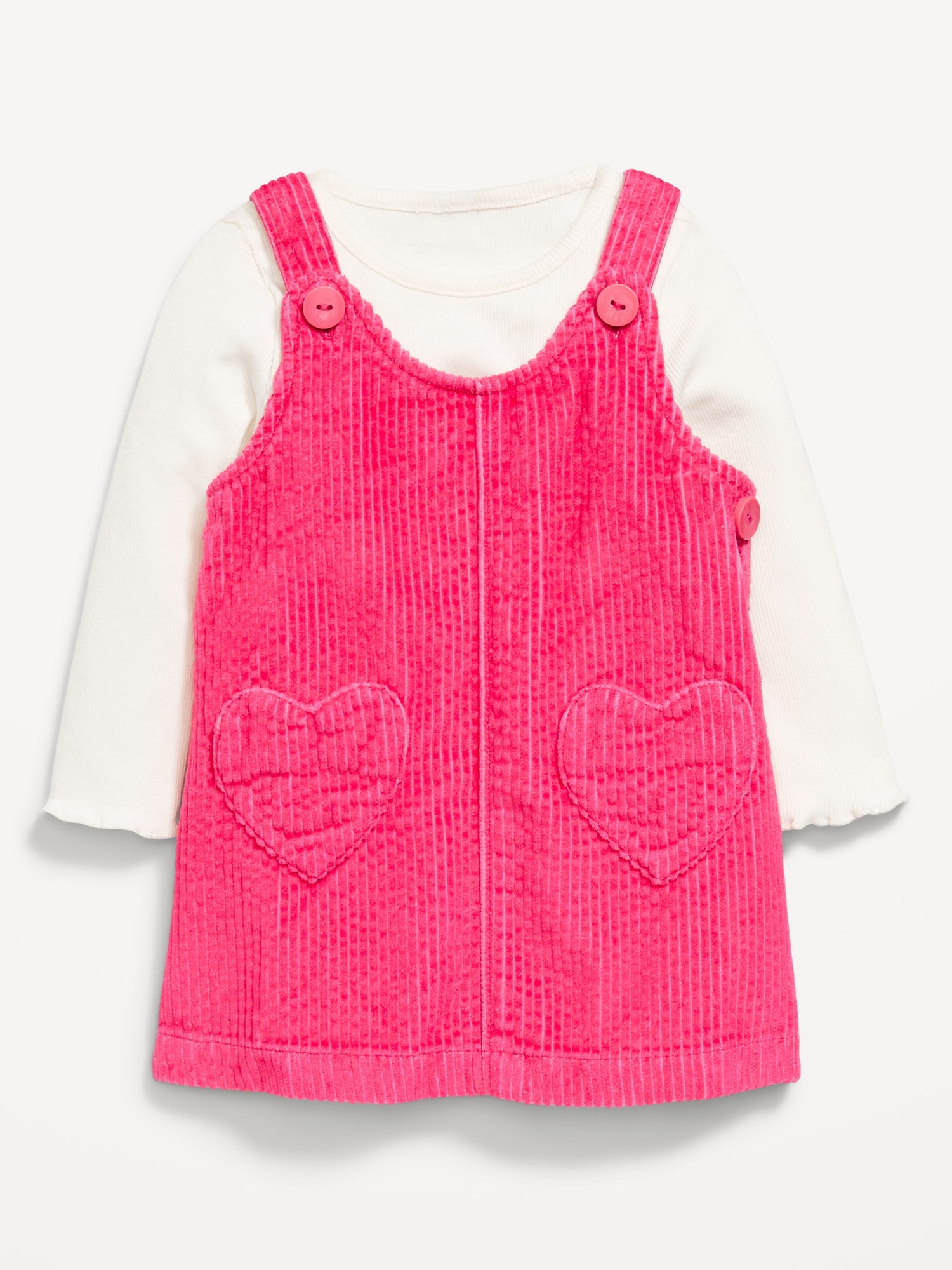 Long-Sleeve Ribbed T-Shirt and Corduroy Dress Set for Baby: round neckline, long sleeves, coordinating dress, buttoned shoulder straps, side buttoned closure, heart patch pockets, #802742