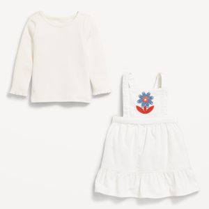 Long-Sleeve Ribbed T-Shirt and Corduroy Dress Set for Baby: round neckline, long sleeves, coordinating dress, wide shoulder straps, embroidered graphic at front, ruffled hem, #802750
