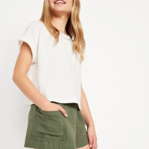 Loose Double-Weave Utility Shorts for Girls: elasticized waistband, decorative button front, utility patch pockets at each side, all-over print, #767129