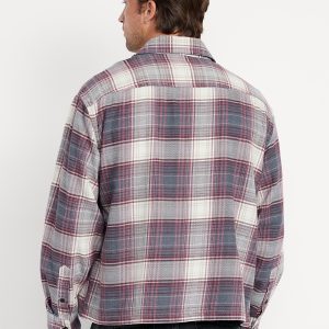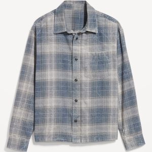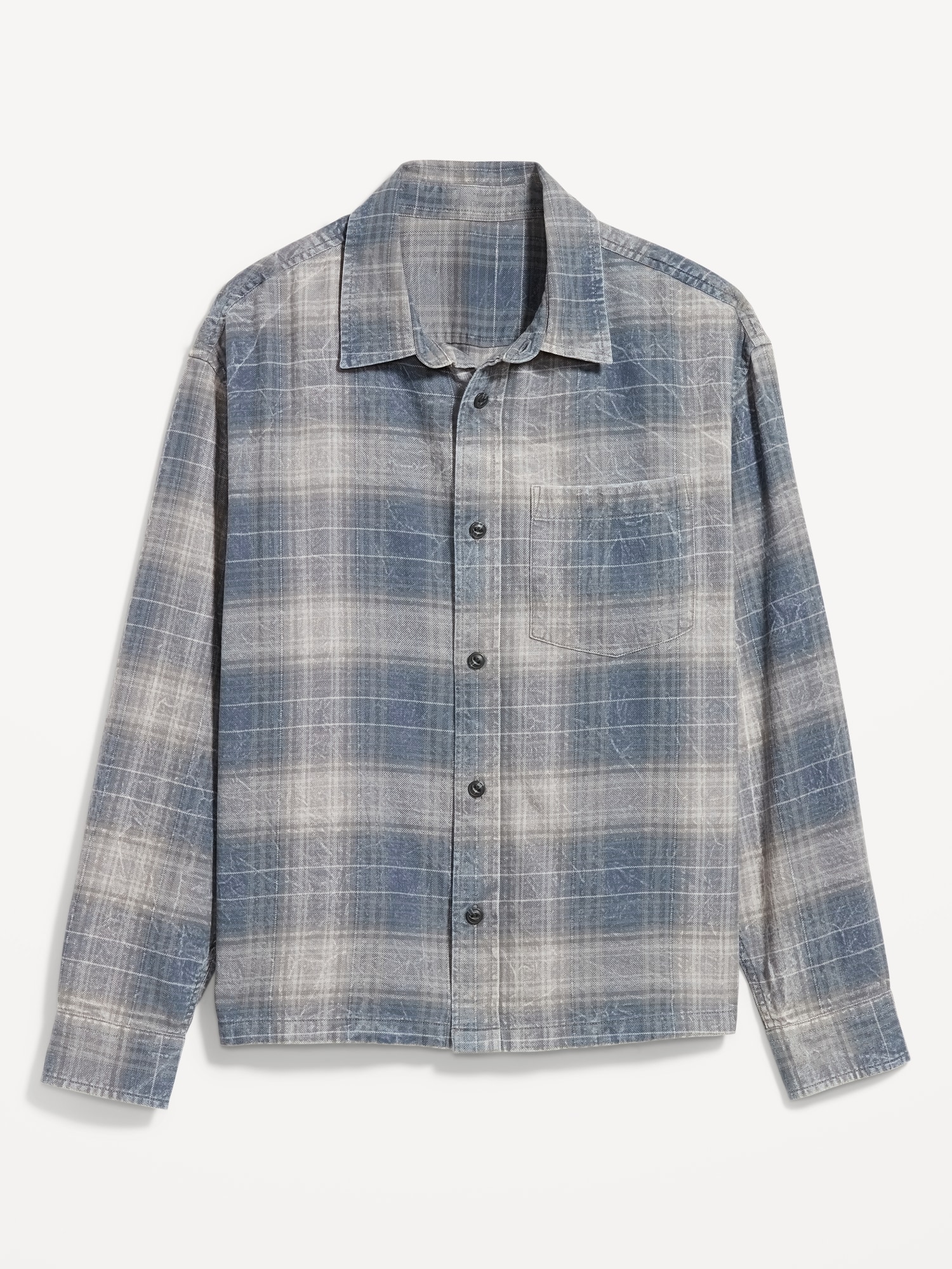 Loose Fit Cropped Plaid Flannel Shirt: spread collar, long sleeves with buttoned cuffs, full-button front, patch chest pocket, plaid print, #805557