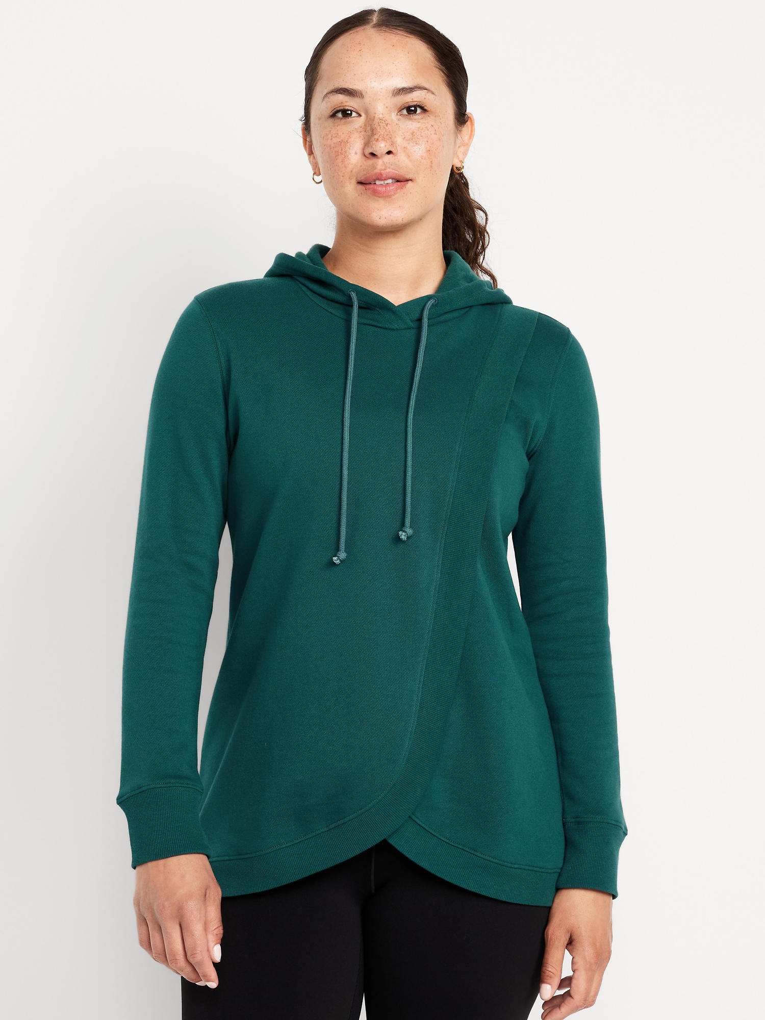 Maternity Cross-Front Nursing Pullover Hoodie: adjustable drawstring hood, long sleeves, rib-knit cuffs, cross front for convenient nursing access, rib-knit front and hem, pullover style, #578188