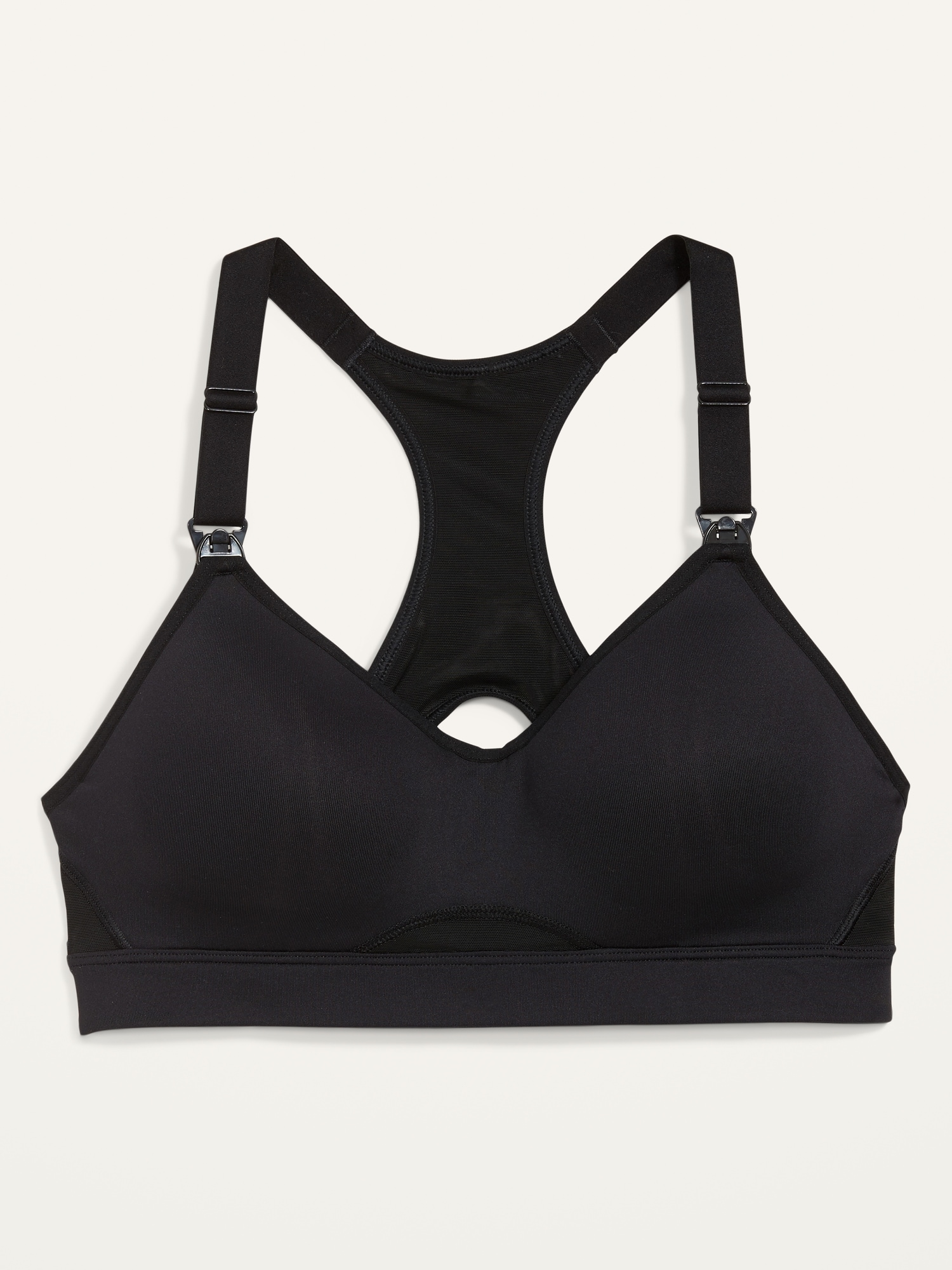 Maternity High Support Nursing Sports Bra: Wide adjustable shoulder straps, with detachable clips for convenient nursing access., Sweetheart neckline, with breathable mesh racerback., Built-in shaped cups., Banded elastic hem, with adjustable hook-and-eye strap at center back for easy wear & a personalized fit., Go-Dry moisture-wicking technology keeps you dry & comfortable., #687235
