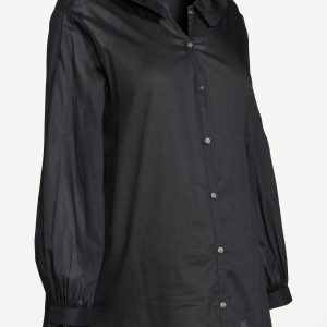 Maternity Long Sleeve Button-Down Ruffle Shirt: flat ruffle collar, button closure, cuffed sleeves, lace trim at collar, #826404