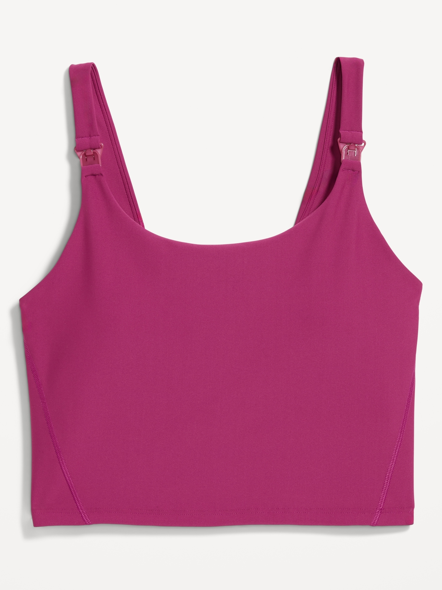 Maternity PowerSoft Nursing Sports Bra: Featuring PowerSoft. A stretchy, peachy-smooth fabric with light compression.scoop neck, adjustable shoulder straps, detachable clips for convenient nursing, cross-cross straps at back, removable pads, go-dry wicks moisture, #434639