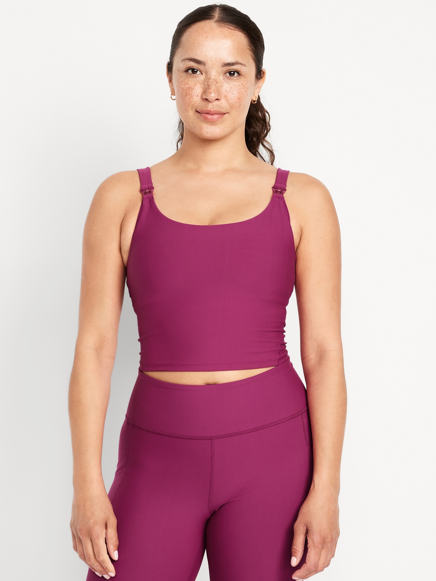 Maternity PowerSoft Nursing Sports Bra: Featuring PowerSoft. A stretchy, peachy-smooth fabric with light compression.scoop neck, adjustable shoulder straps, detachable clips for convenient nursing, cross-cross straps at back, removable pads, go-dry wicks moisture, #434639