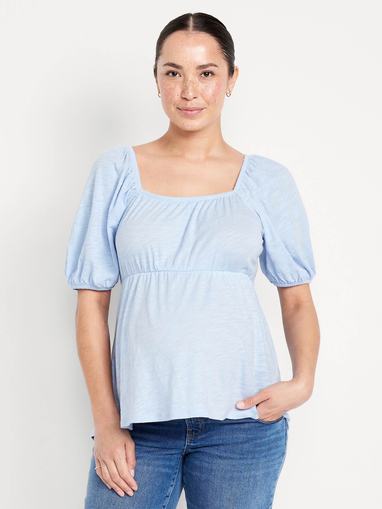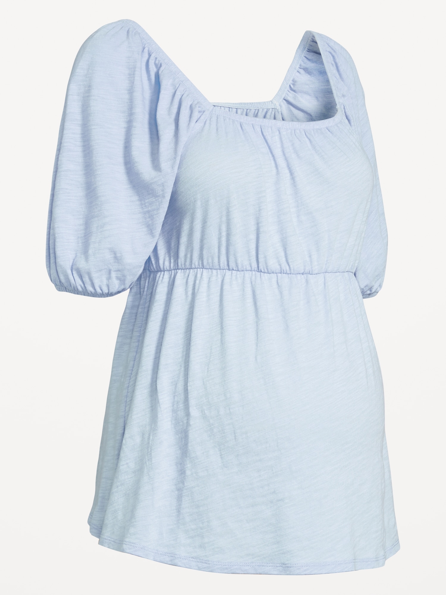 Maternity Puff Sleeve Top: square neck, empire waist, elastic cuffs, flared hem, #771745